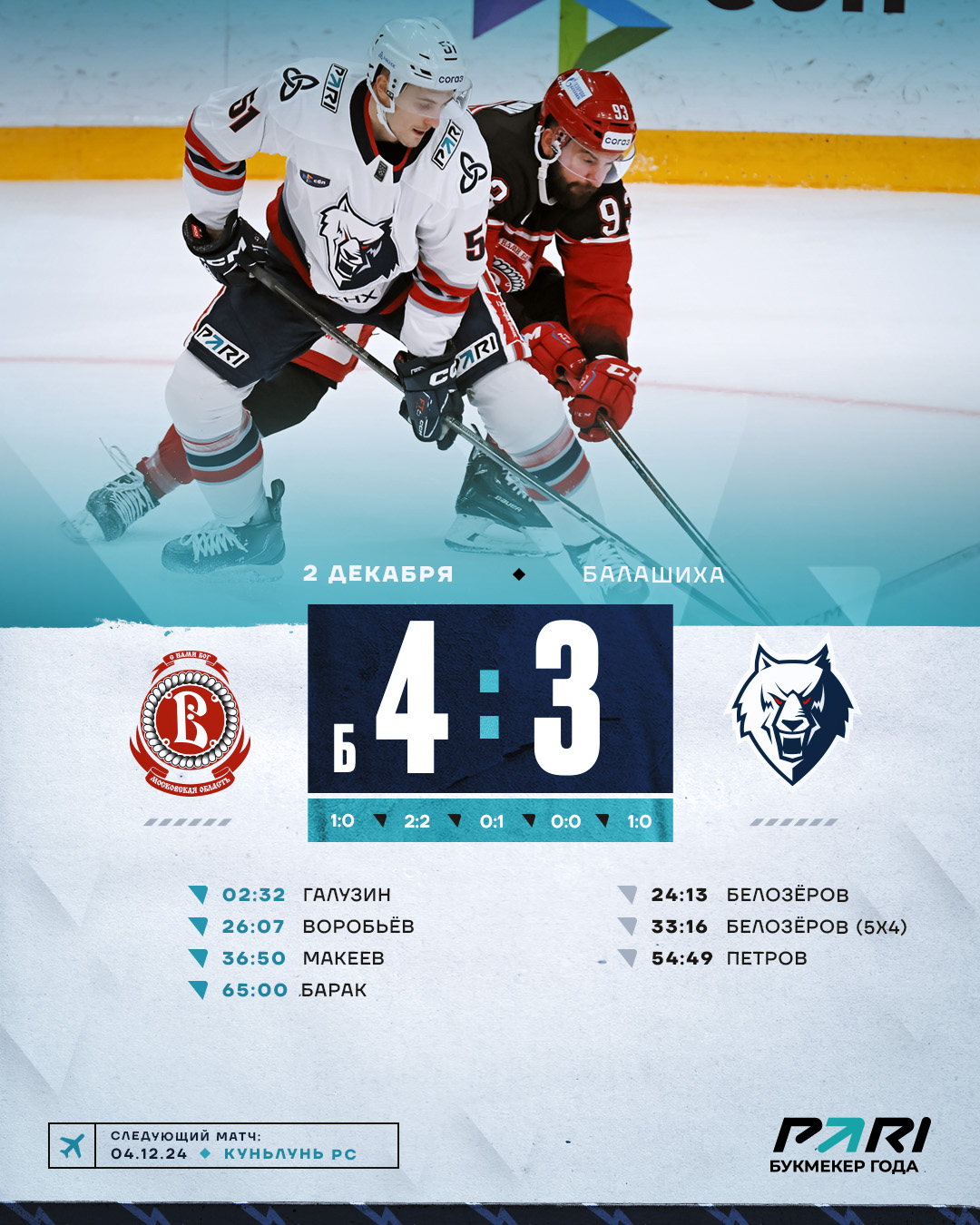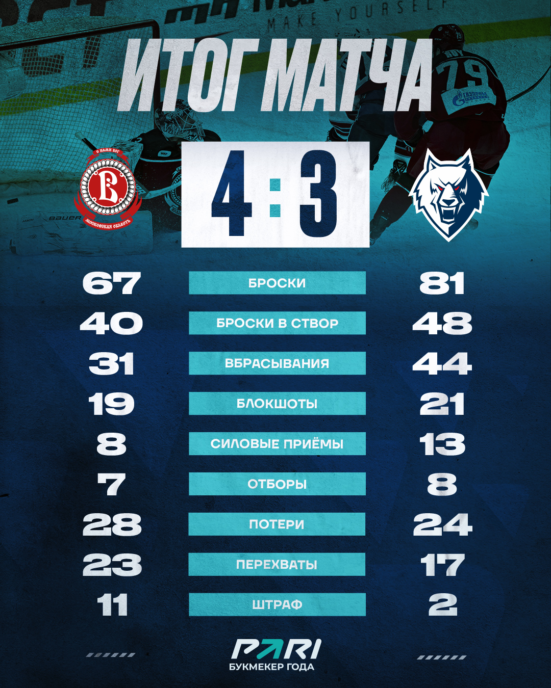 В начало игры осталось хозяевами площадки, которым удалось материализовать свое игровое преимущество. Отличился Галузин - экс-игрок «Нефтехимика». Если до этого гола соперник владел преимуществом, то уже после игра выровнялась. «Волки» отрезками создавали много проблем обороне соперника. Однако на перерыв команды ушли при минимальном счете в пользу «Витязя».В начале второй двадцатиминутки «Витязь» вновь владел игровым преимуществом. Однако отличиться удалось именно «волкам». Белозёров с близкого расстояния сравнял счет. Следом хозяева забрасывают вторую шайбу. Вскоре Белозёров мог оформить дубль. Но его дуэль с голкипером «Витязя» дивидендов нам не принес. Андрею удалось дубль оформить чуть позже, когда хозяева льда остались в меньшинстве. Однако «волки» вновь позволили сопернику вперед выйти.
