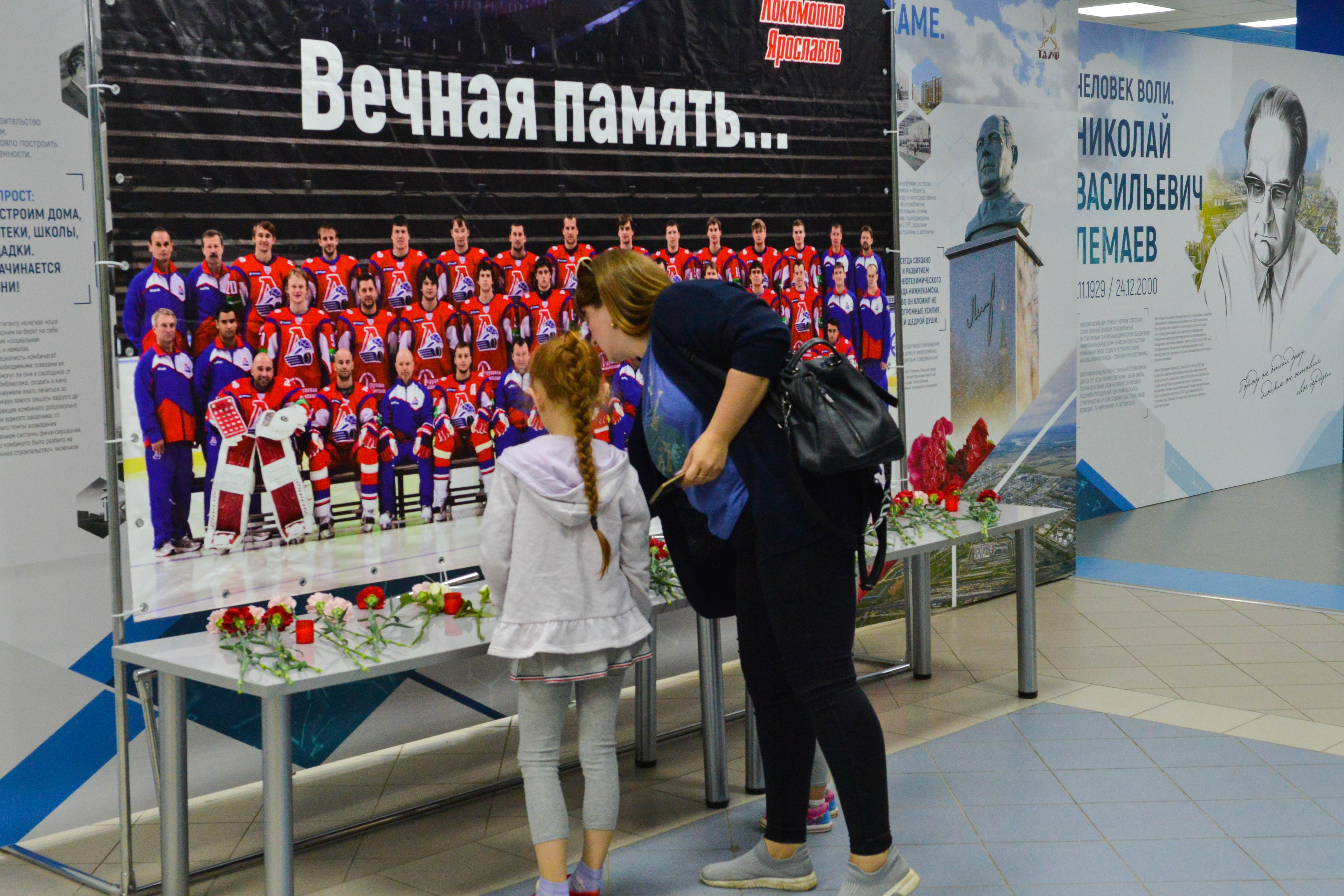 Сегодня день памяти ХК «Локомотив». С самого утра болельщики начали приходить ЛД «Нефтехим-Арена». Здесь по традиции установлен мемориальный стенд памяти погибшей хоккейной команды. Они приносили цветы, зажигали свечи.