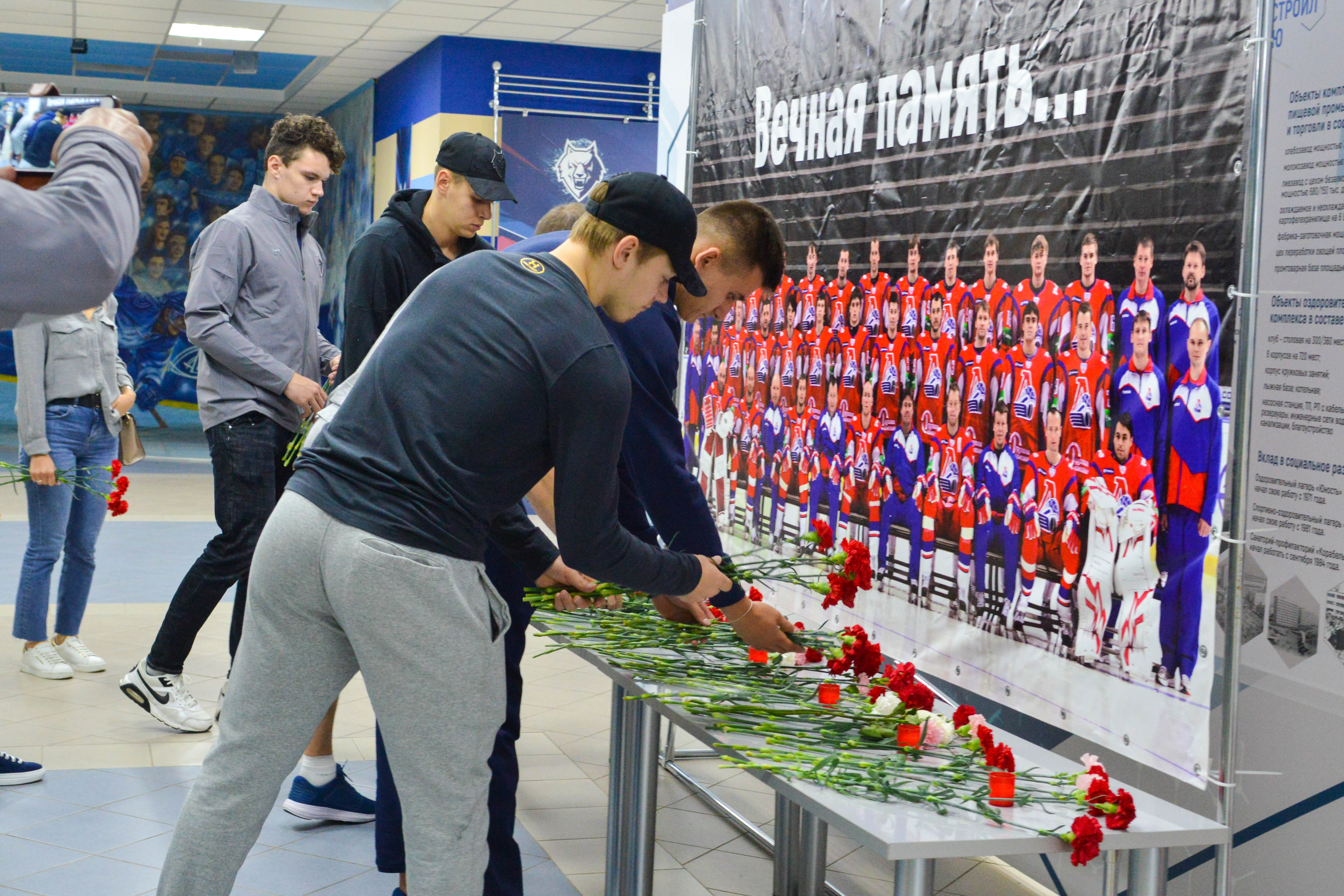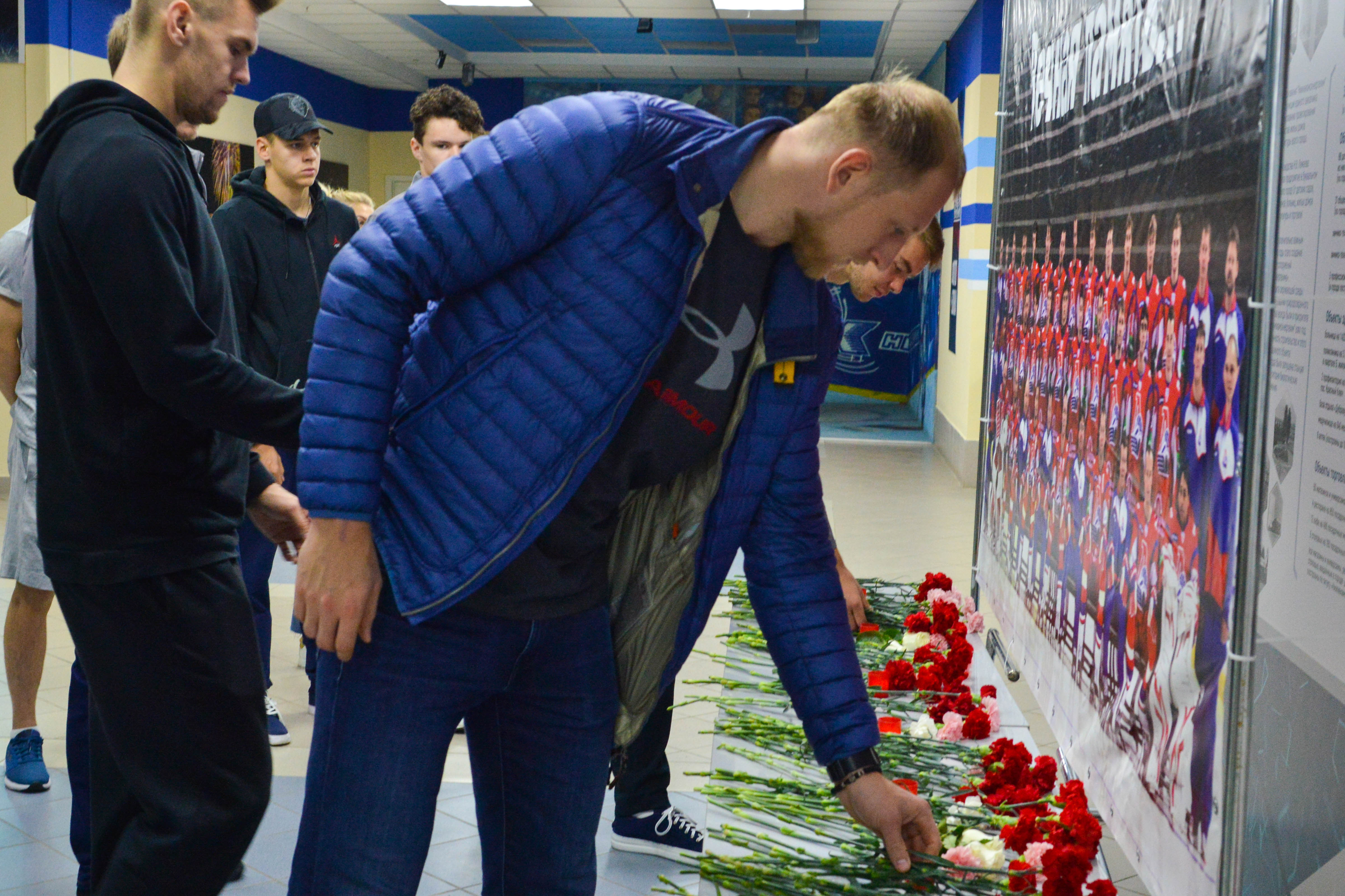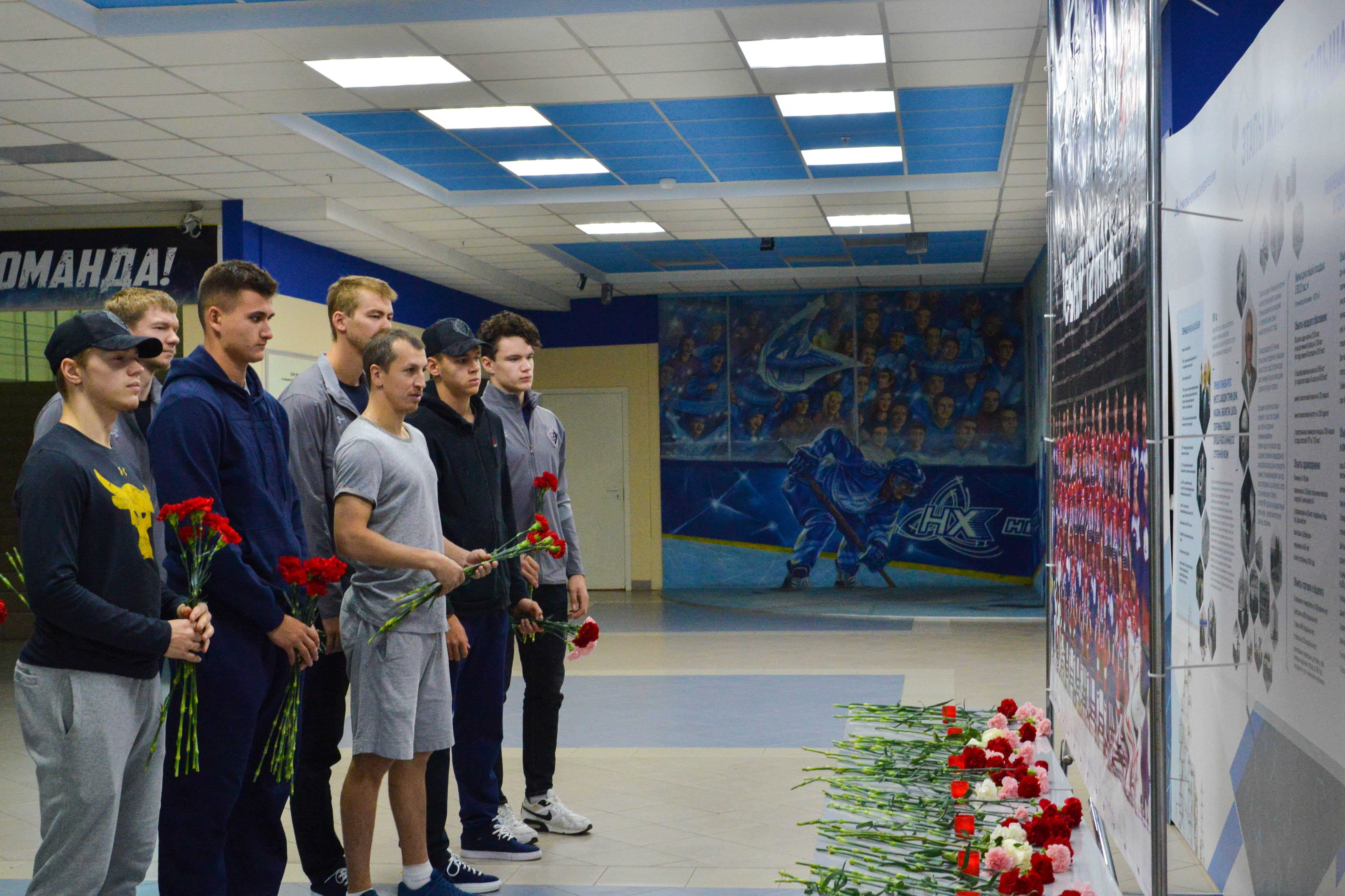 Ближе к вечеру мемориальный стенд посетили и хоккеисты «Нефтехимика». Они также возложили цветы и почтили память погибших минутой молчания.