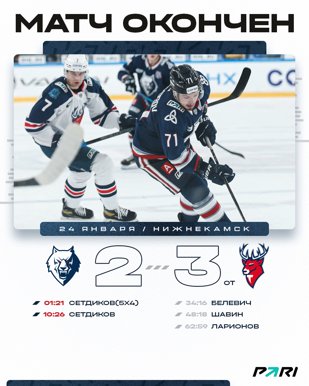 Игра началась для нашей команды лучше не придумаешь. К 11-й минуте нижнекамцы повели 2:0 благодаря дублю Никиты Сетдикова. Как оказалось на этом наши голевые успехи в этот вечер завершены.Во втором и третьем периодах гости отыграли по одной шайбе, а в овертайме смогли вырвать победу. Терпим обидное поражение 2:3, но в таблицу записываем крайне важный балл.