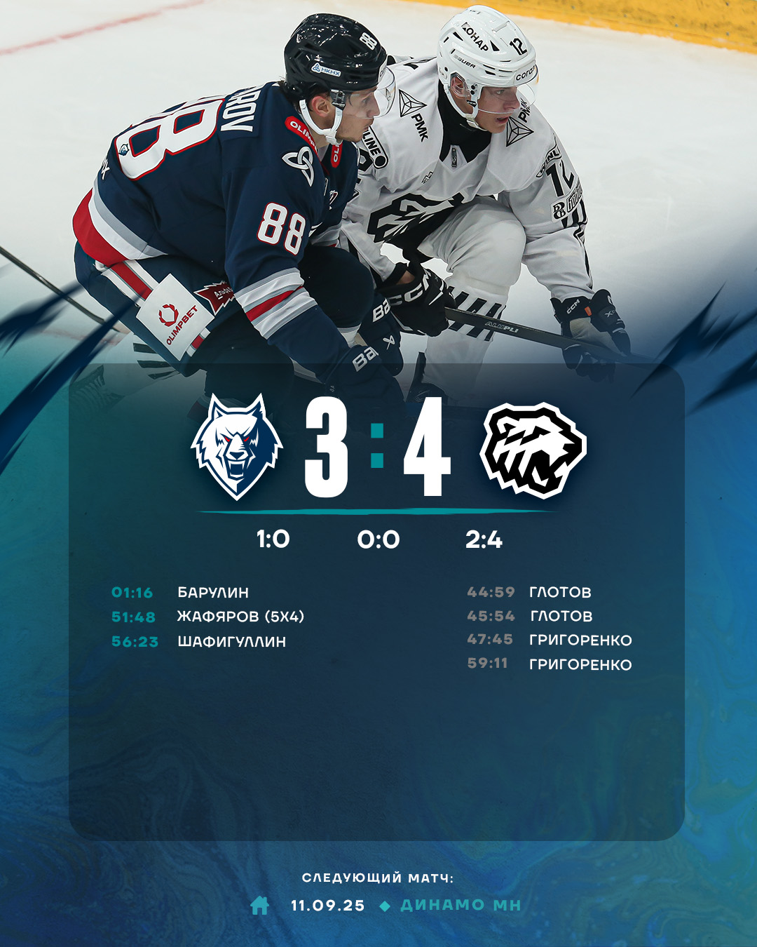 Основные события в матче произошли в третьем периоде. В течение меньше чем трех минут «волки» оказались в роли догоняющих 1:3. Более того, с трудом верилось, что «нефтехимики» смогут перевернуть игру. Отыграть две шайбы у финалиста Кубка Гагарина минувшего сезона не так-то просто. Но тут взял тайм-аут рулевой «волков» Игорь Гришин, который нашел нужные слова. И его подопечные с новой силой ринулись в бой. На 57-й минуте на табло горели цифры 3:3. Жафяров и Шафигуллин стали авторами этих голов. Однако заработать хотя бы один балл в этот вечер не суждено было. Тем не менее, несмотря на поражение, трудно в чем-то упрекнуть нашу команду. Надо верить в себя, и все будет хорошо.
