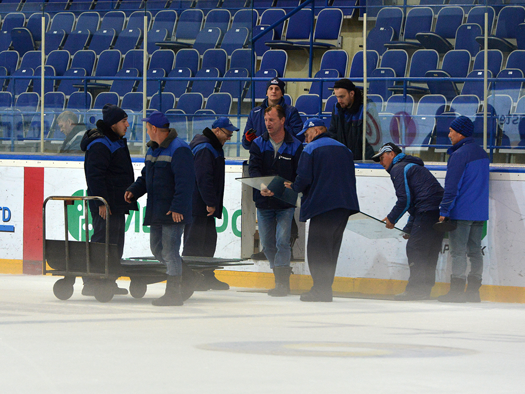 Прокомментировать проводимую работу мы попросили начальника службы подготовки льда Александра Носова.- Мы сегодня приступили к демонтажу ледовой площадки, которой уже 12 лет. Сейчас снимаем бронированные стекла за воротами, весь каждого которой 170 кг, сказал Александр Витальевич.