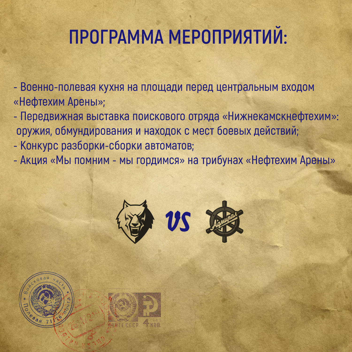 О других мероприятиях читайте на картинке ниже. Также напоминаем, что каждый пришедший на матч с фотографией своего родственника - участника ВОВ, получит пригласительный билет на матч "Нефтехимика".