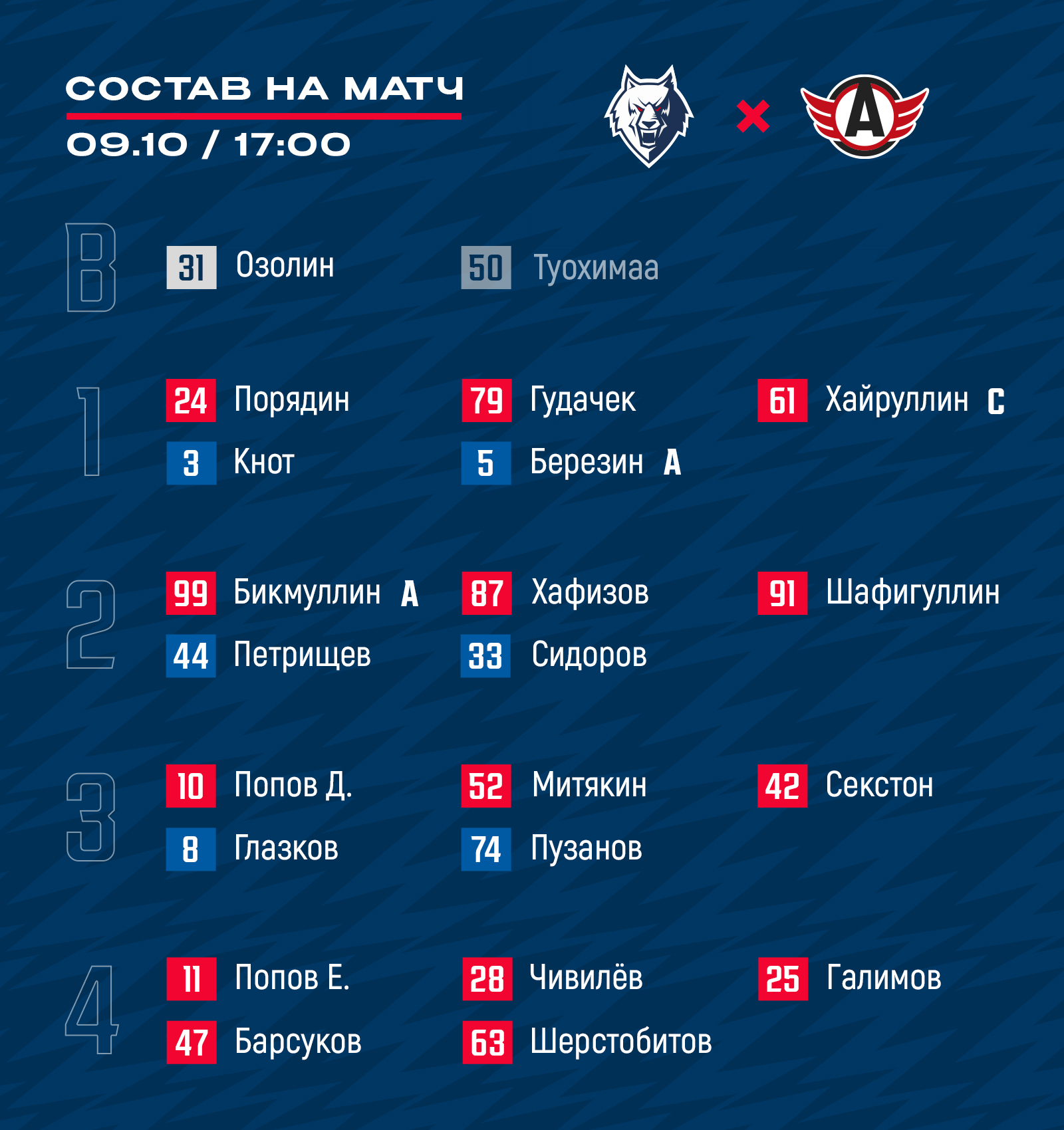 Стал известен состав нашей команды команды на матч регулярного чемпионата КХЛ с «Автомобилистом».