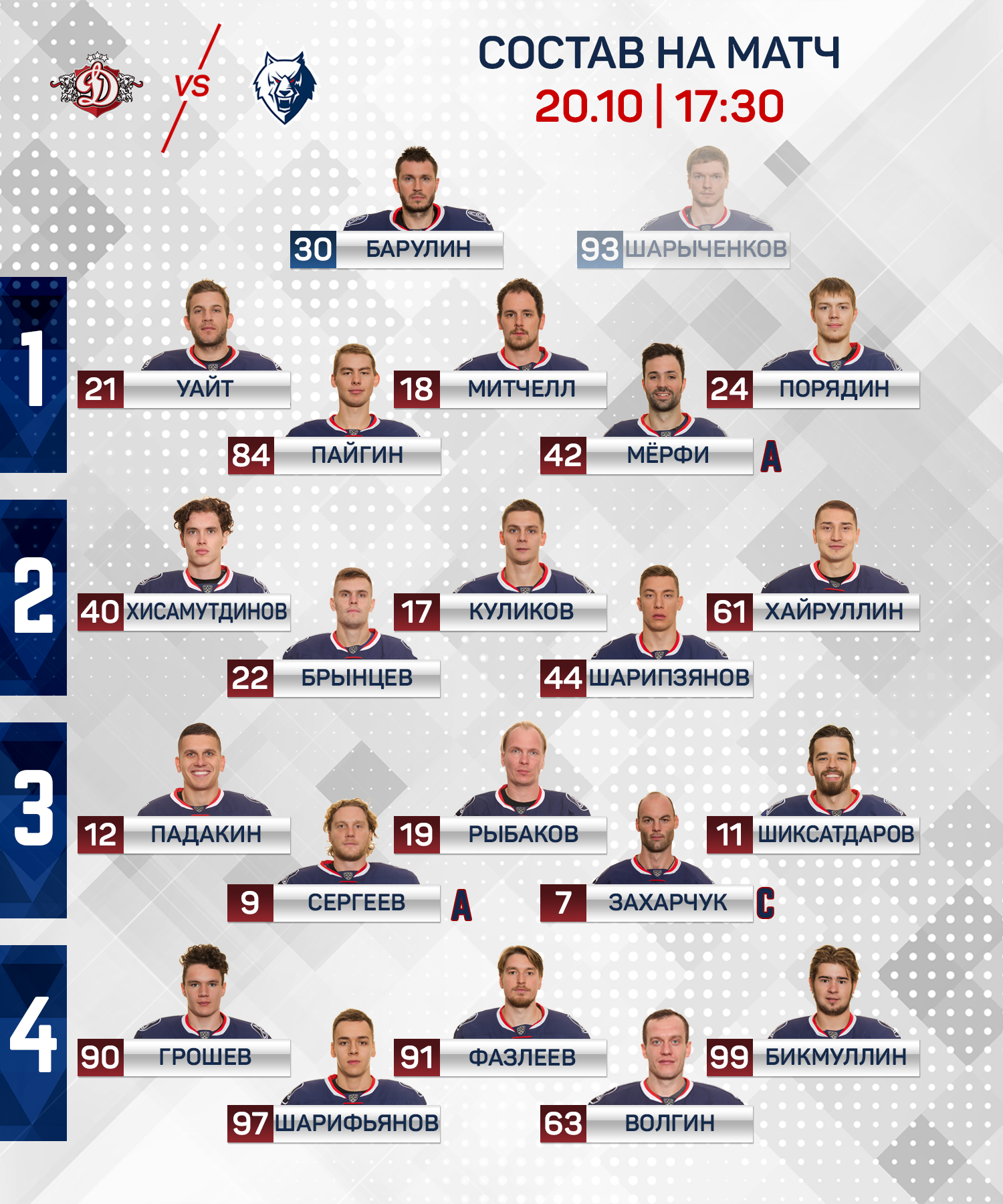 Стал известен состав нашей команды на первый домашний матч регулярного сезона с рижским «Динамо», который в 19 часов стартует на «Нефтехим Арене».