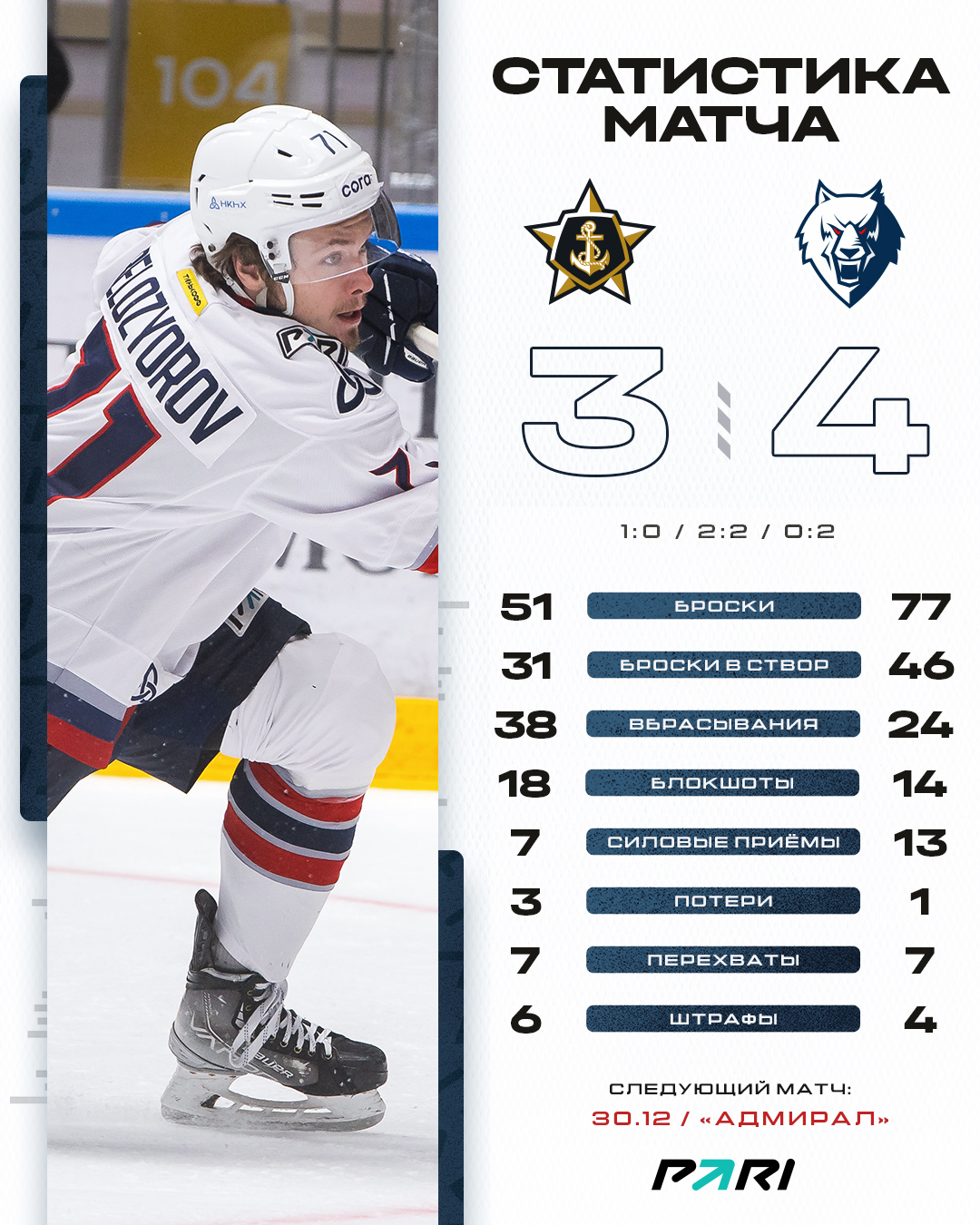 Наша команда продолжает дальневосточный выезд. Сегодня во Владивостоке «волки» переиграли «Адмирал» со счетом 4:3.