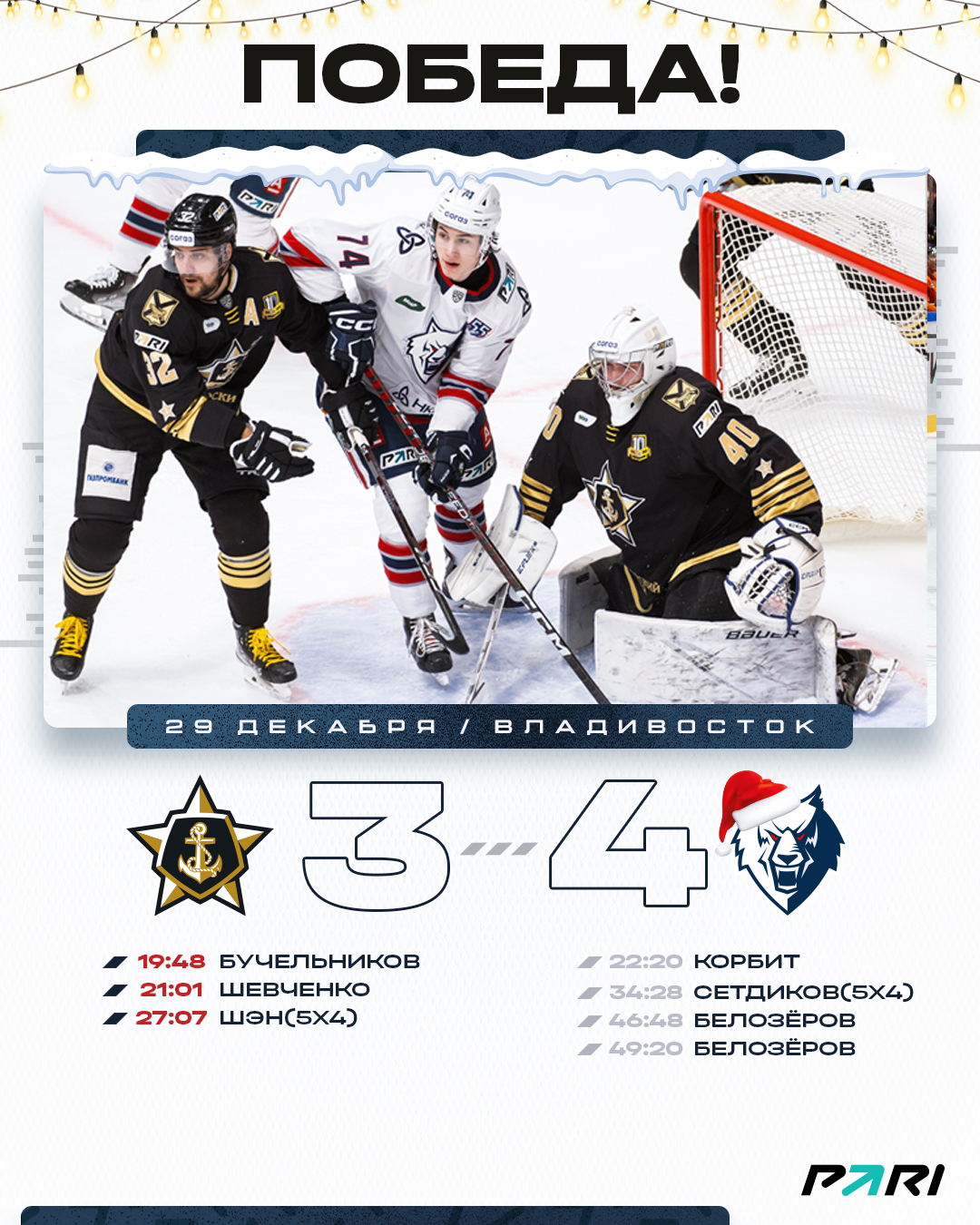 Победа получилась волевой. К 23-минуте мы уступали 0:2, но именно в этот момент дальний бросок сегодняшнего дебютанта Егора Корбита достиг цели. Хозяева не огорчились и снова повели в два гола реализовав большинстве. На это ответил своей шайбой Никита Сетдиков, также в большинстве.Исход матча решился в третьем периоде. Андрей Белозеров оформил дубль и принес нам крайне важную победу 4:3.