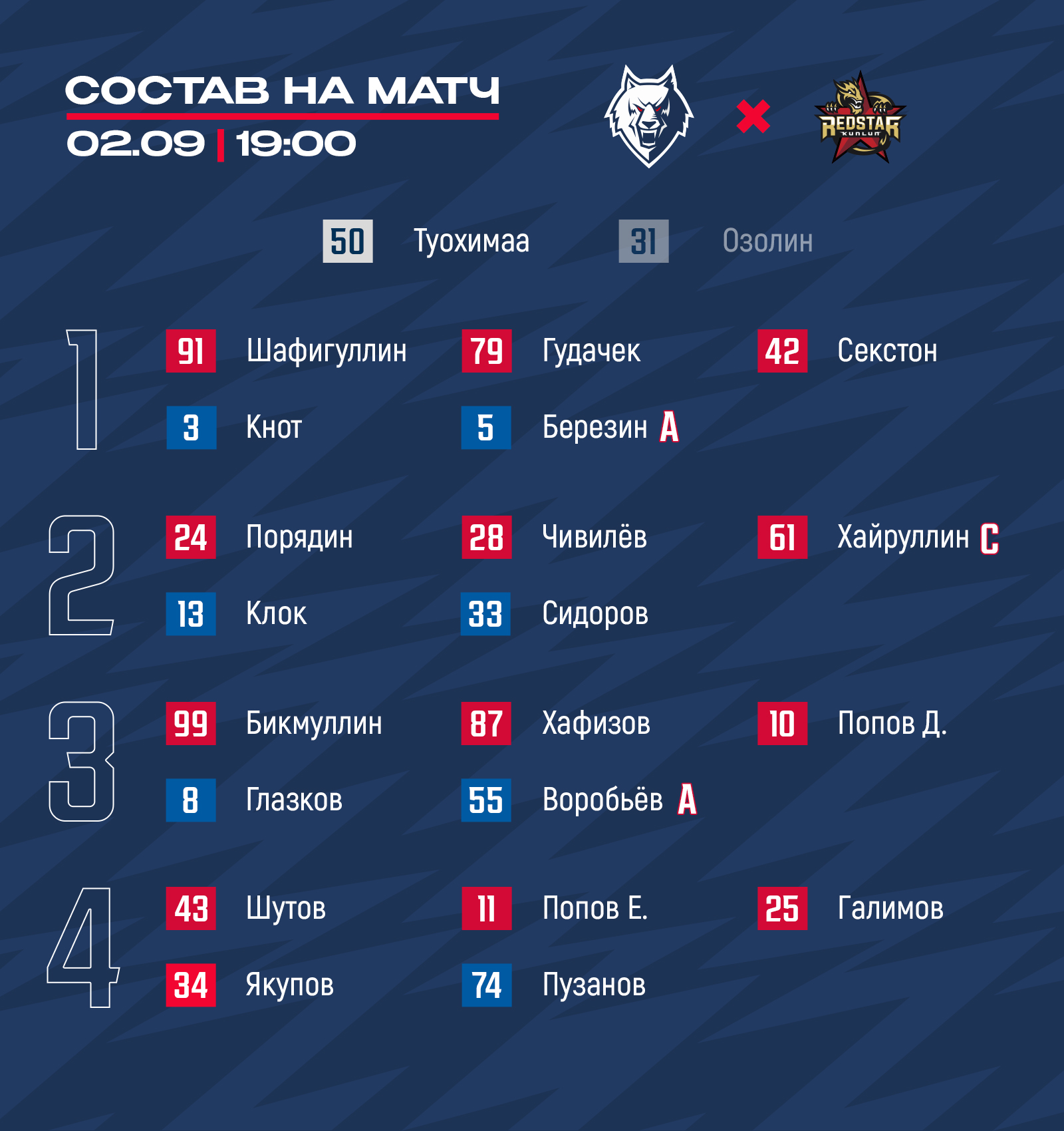 Стал известен состав нашей команды команды на стартовый матч регулярного чемпионата КХЛ с «Куньлунь РС».