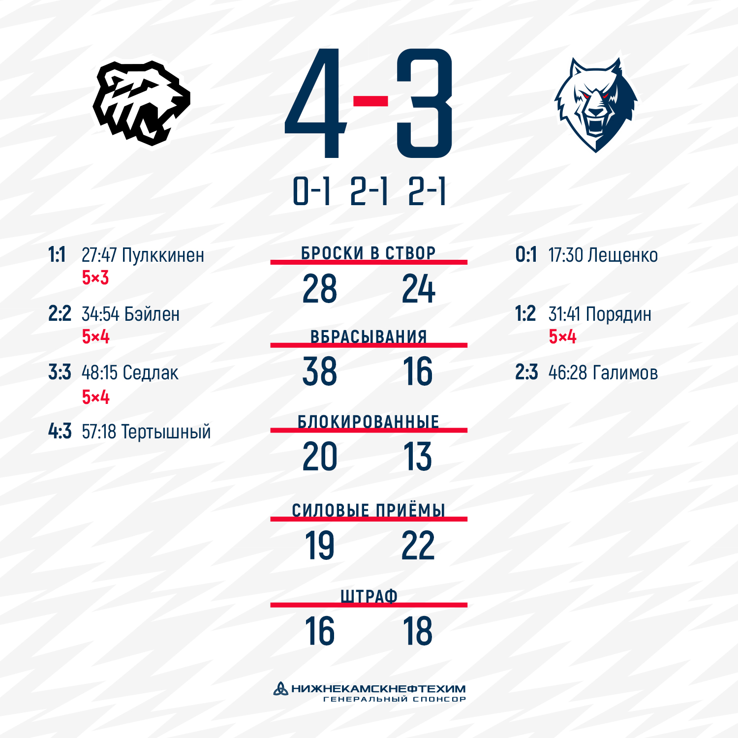 В первом периоде Вячеслав Лещенко вывел нас вперед. Хозяева отыгрались в середине вторых 20 минут. Однако Павел Порядин, также в большинстве, снова сделал цифры на табло в нашу пользу. Уйти на второй перерыв с преимуществом нижнекамцам не удалось. «Трактор» в очередной раз реализовал численное преимущество.Исход поединка решился в третьем периоде. Ансель Галимов в третий раз сделал счет в нашу пользу, но спустя 2 минуты на табло цифры в очередной раз сравнялись. Встречала уже катилась к овертайму, но хозяева на 58-й минуте впервые повели в счете и, как оказалось, забили победную шайбу.