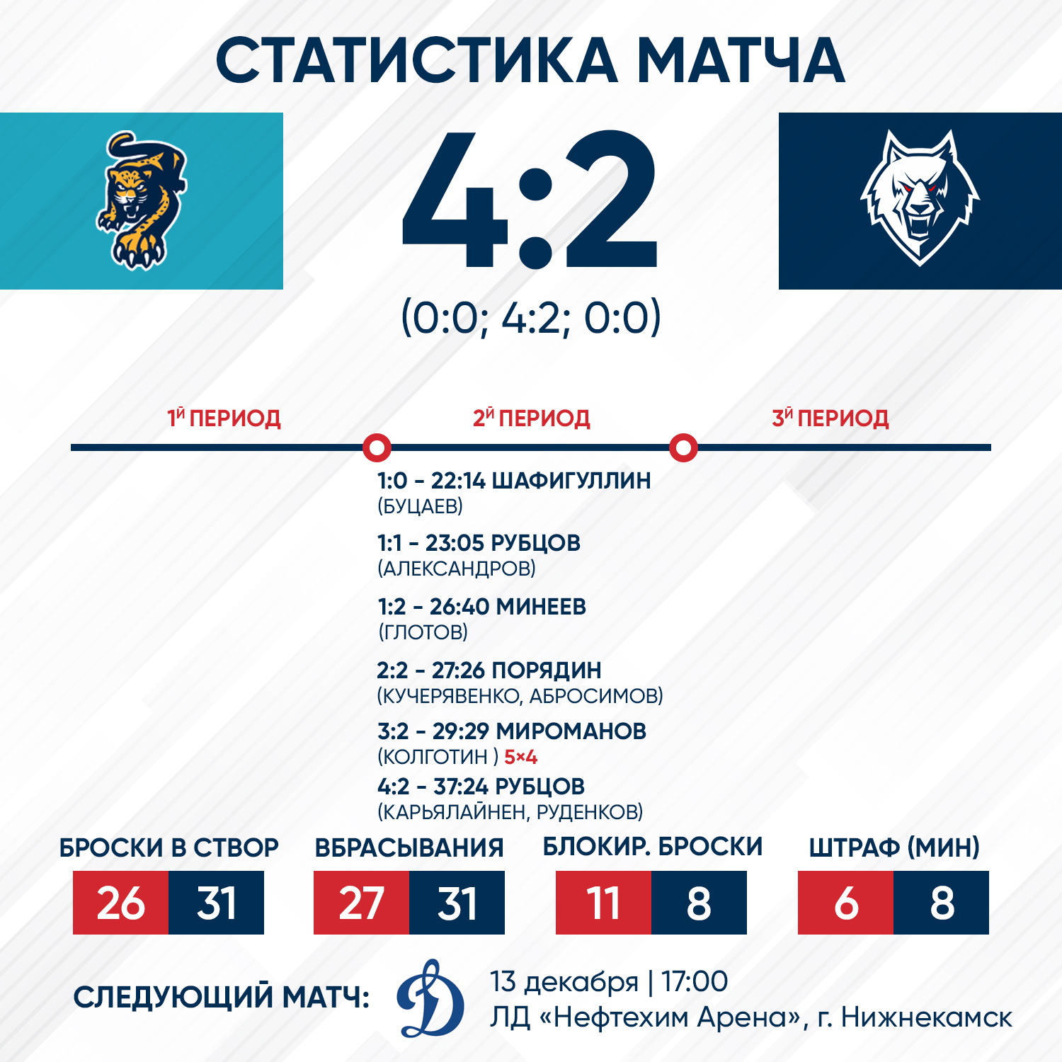 Все шайбы в этом поединке были заброшены во втором периоде. Счет открыл Булат Шафигуллин, но хозяева смогли быстро сравнять цифры на табло, а затем и выйти вперед. Павел Порядин снова сделал счет равным - 2:2. Однако «леопарды» до конца второй двадцатиминутки отличились еще дважды.В третьем периоде счет не изменился. 2:4 - поражение «волков».