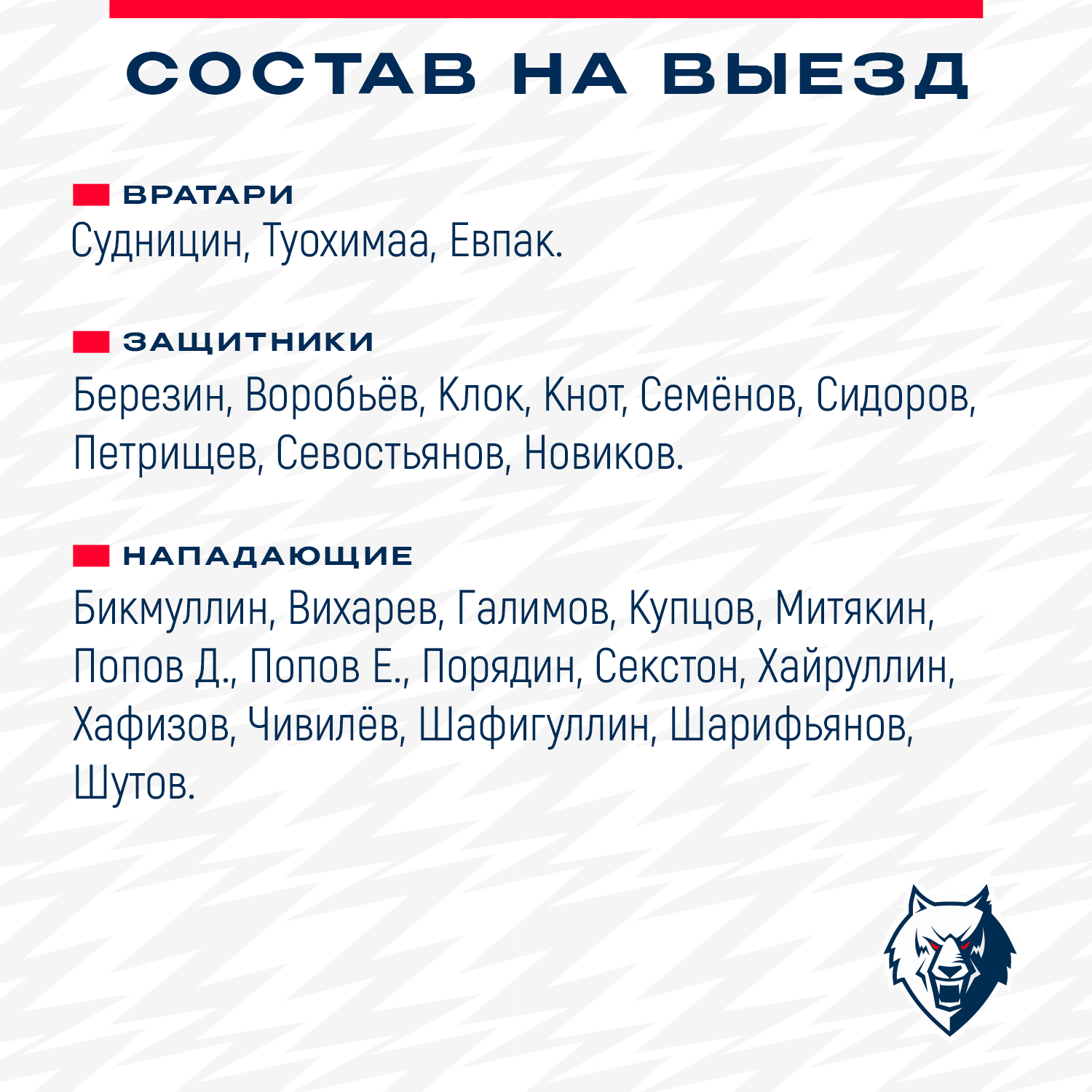 Тренерский штаб Олега Леонтьева взял в поездку следующих игроков.