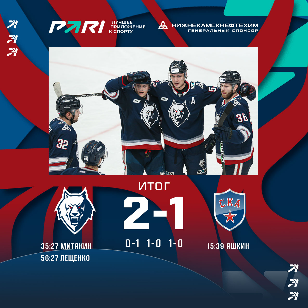 Победа получилось волевой. Гости открыли счет в первом периоде. Вернул в игру «волков» Евгений Митякин, который реализовал большинство во вторые 20 минут.Исход поединка с лидером сезона решился в концовке. Ансель Галимов и Вячеслав Лещенко в меньшинстве провели быструю атаку и забросили шайбу, которая и принеслам нам такую важную победу.
