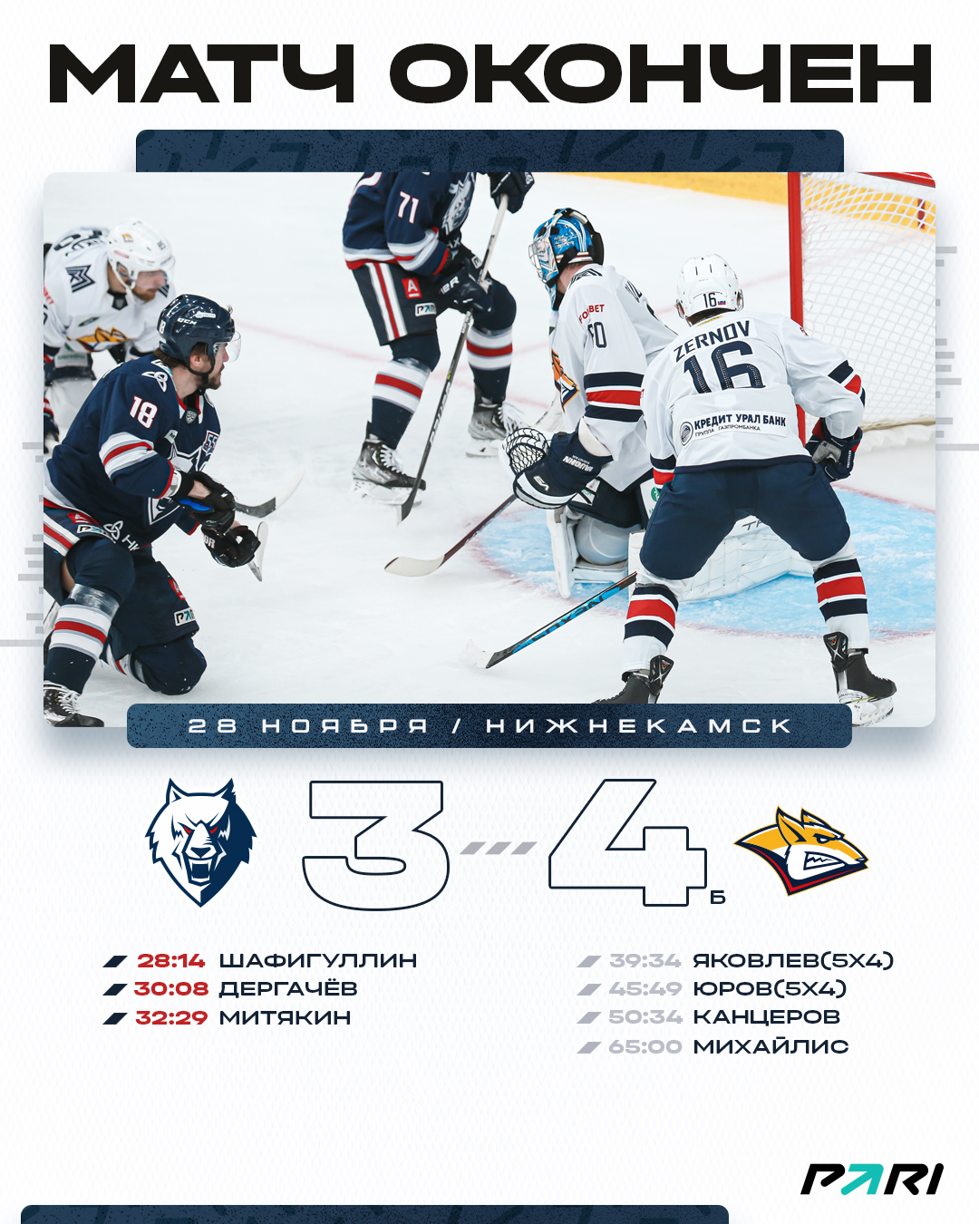 Первый период обошелся без заброшенных шайб, а вот вторая двадцатиминутка получилась очень результативной. С 28-й по 33-ю минуты наша команда забросила три шайбы. Отличились Булат Шафигуллин, Александр Дергачёв и Евгений Митякин. Уйти на перерыв ведя в три гола нам не удалось. Гости в самой концовке реализовали большинство.В третьем периоде наша команда пережила настоящий штурм ворот. «Волки» за матч заблокировали более 30 бросков за игру, но этого не хватило, чтобы удержать победный счет. «Металлург» в основное время счет сравнял, а в серии послематчевых бросков все решила одна точная попытка гостей.