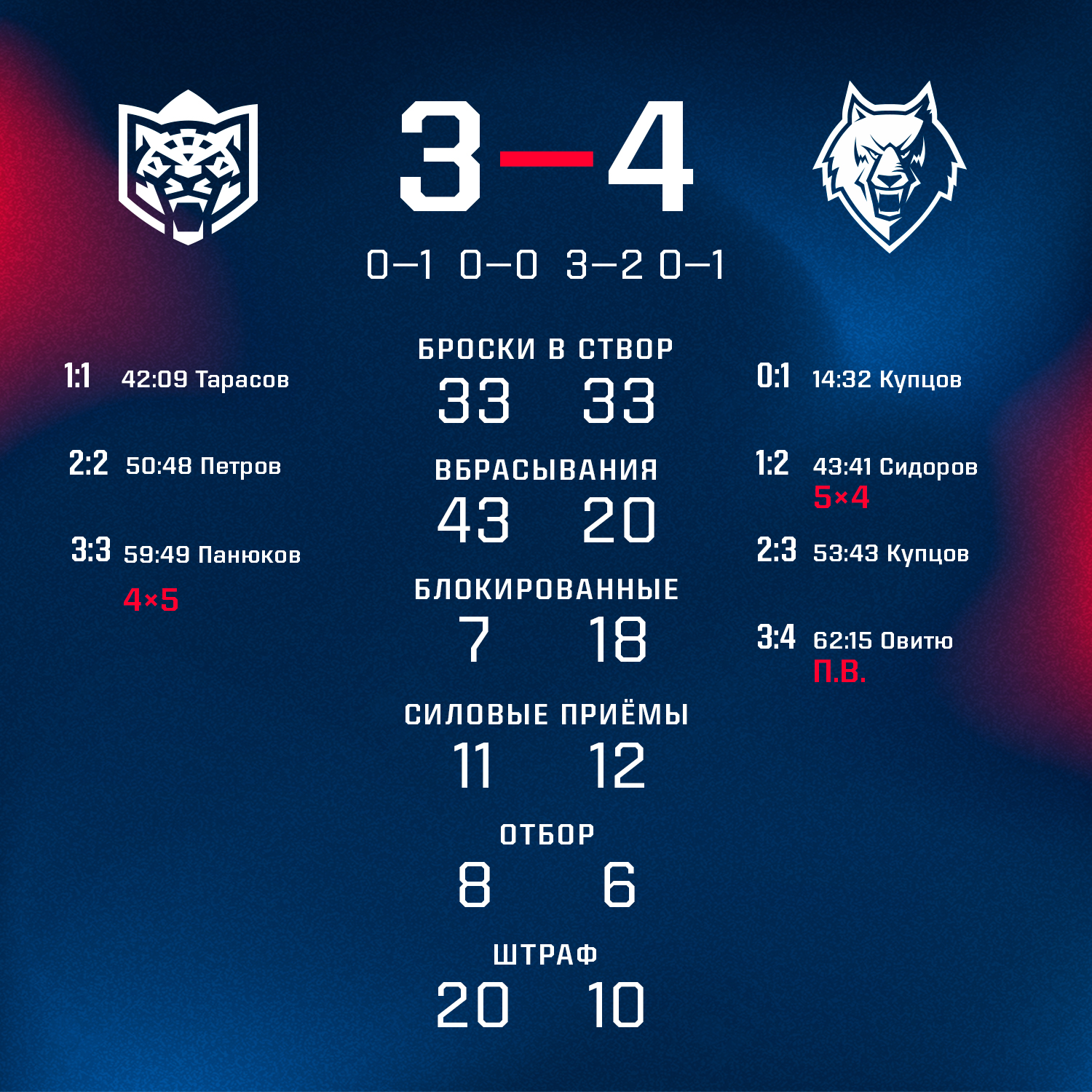 По ходу поединка «волки» трижды выходили вперед благодаря шайбам Михаила Сидорова и дублю Сергея Купцова, но хозяева каждый раз на наш гол отвечали своим.Очень драматичная игра перешла в овертайм, где «барсы» решили рискнуть и при игре 3 на 3 заменили вратаря на четвертого полевого, чем мы и воспользовались. Йоанн Овитю поразил пустые ворота и принес «волкам» вторую победу на турнире.