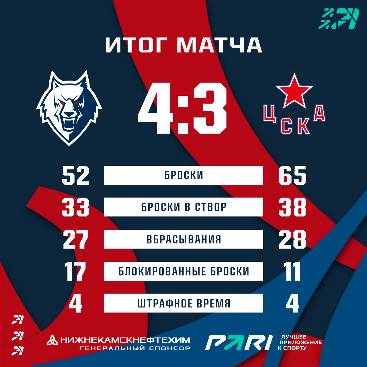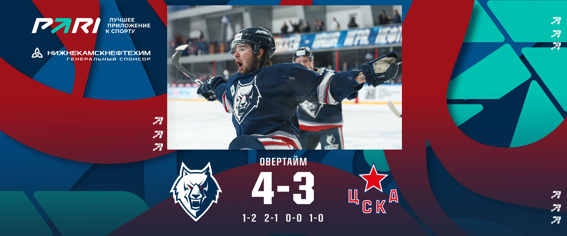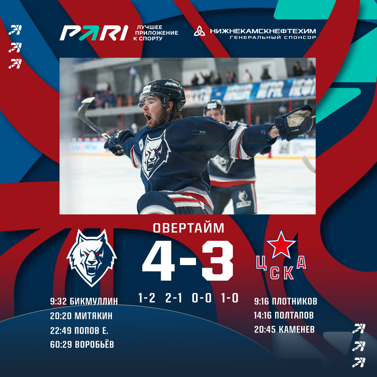 По ходу прошедшего поединка нижнекамцы трижды уступали в счете и каждый раз проявляли волю и сравнивали счет. Голами у нас отличились Рафаэль Бикмуллин, Евгений Митякин и Егор Попов.Счет 3:3 продержался до овертайма в котором гости сняли вратаря, но наша команда перехватила шайбу и Кирилл Воробьёв забросил победный гол!