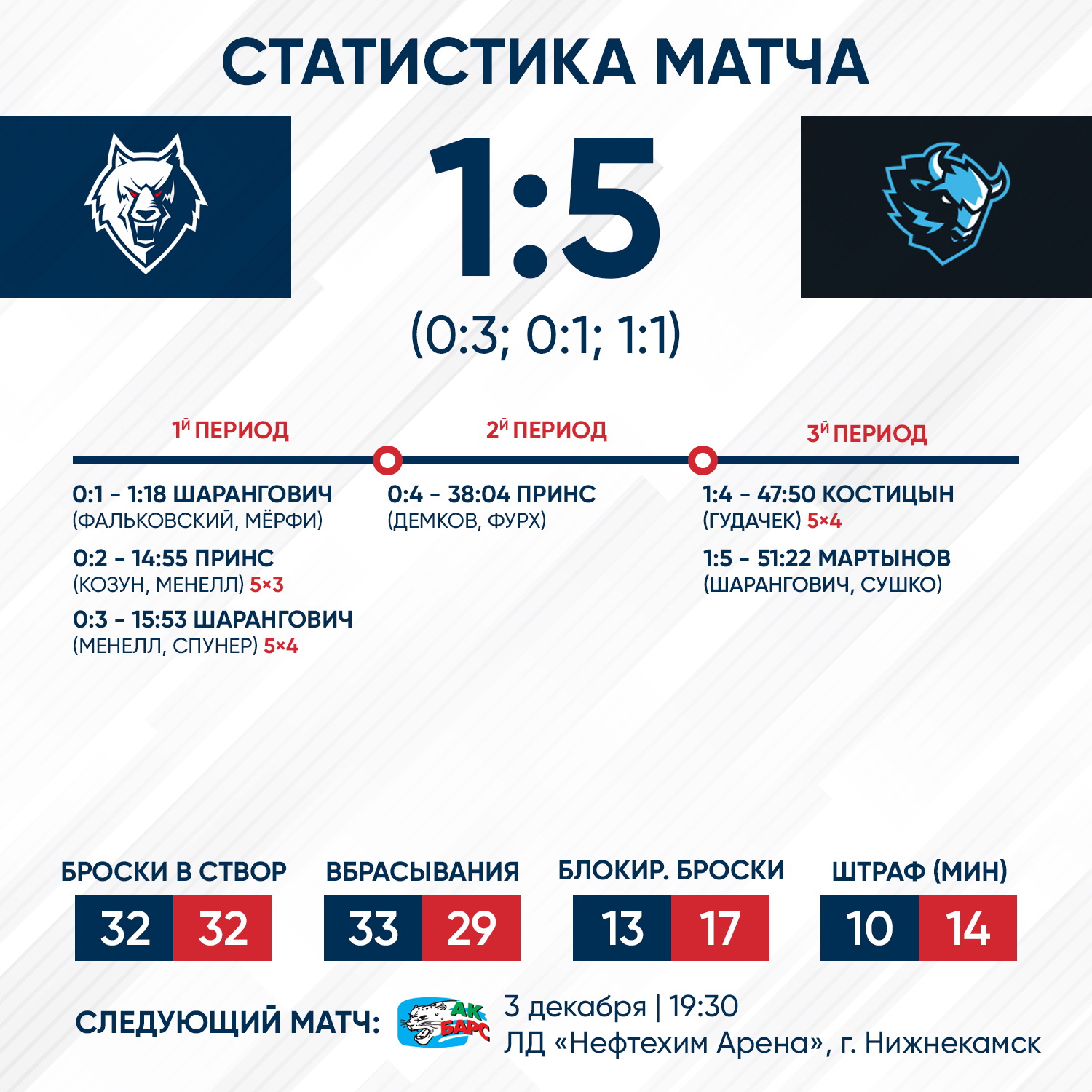 Минчане в первом периоде создали себе задел в три шайбы в первом периоде и затем, довольно уверено, довели игру до победы. Единственный гол у «волков» сегодня забросил Андрей Костицын, который в большинстве поразил ворота своей бывшей команды.В следующем матче «Нефтехимик» сыграет с «Ак Барсом». Четвертое в сезоне дерби Татарстана состоится 3 декабря в 19.30. Билеты можно приобрести в кассах или онлайн на нашем сайте.