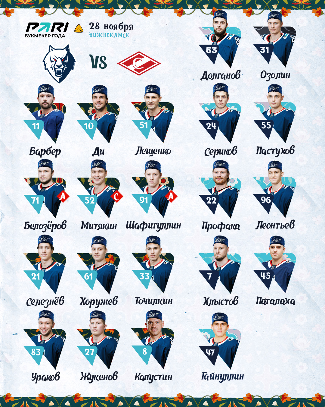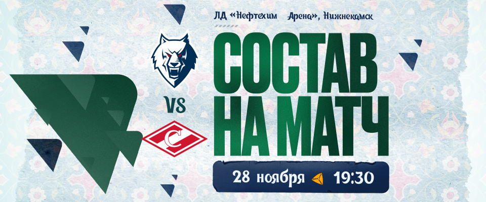 Тренерский штаб Олега Леонтьева назвал состав «Нефтехимика» на домашний матч FONBET Чемпионата КХЛ сезона 2024/2025 с московским «Спартаком».