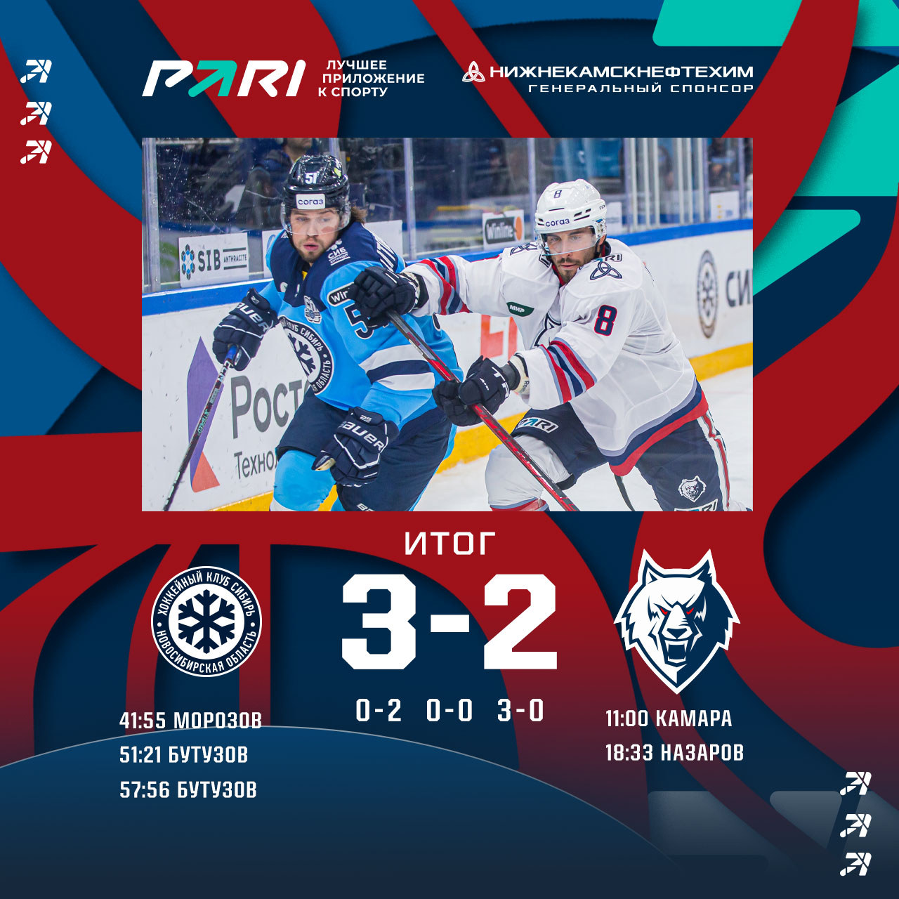 После первого периода «волки» вели 2:0 благодаря шайбам Энтони Камара и Михаила Назарова. Во вторые 20 минут счет не изменился, а вот заключительный период нижнекамцам вообще не удался. Были пропущены три безответный шайбы и в результате поражение 2:3…Следующий матч «Нефтехимик» проведет дома 23 сентября, когда сыграет с челябинским «Трактором». Билеты можно приобрести в кассах или онлайн на нашем сайте.