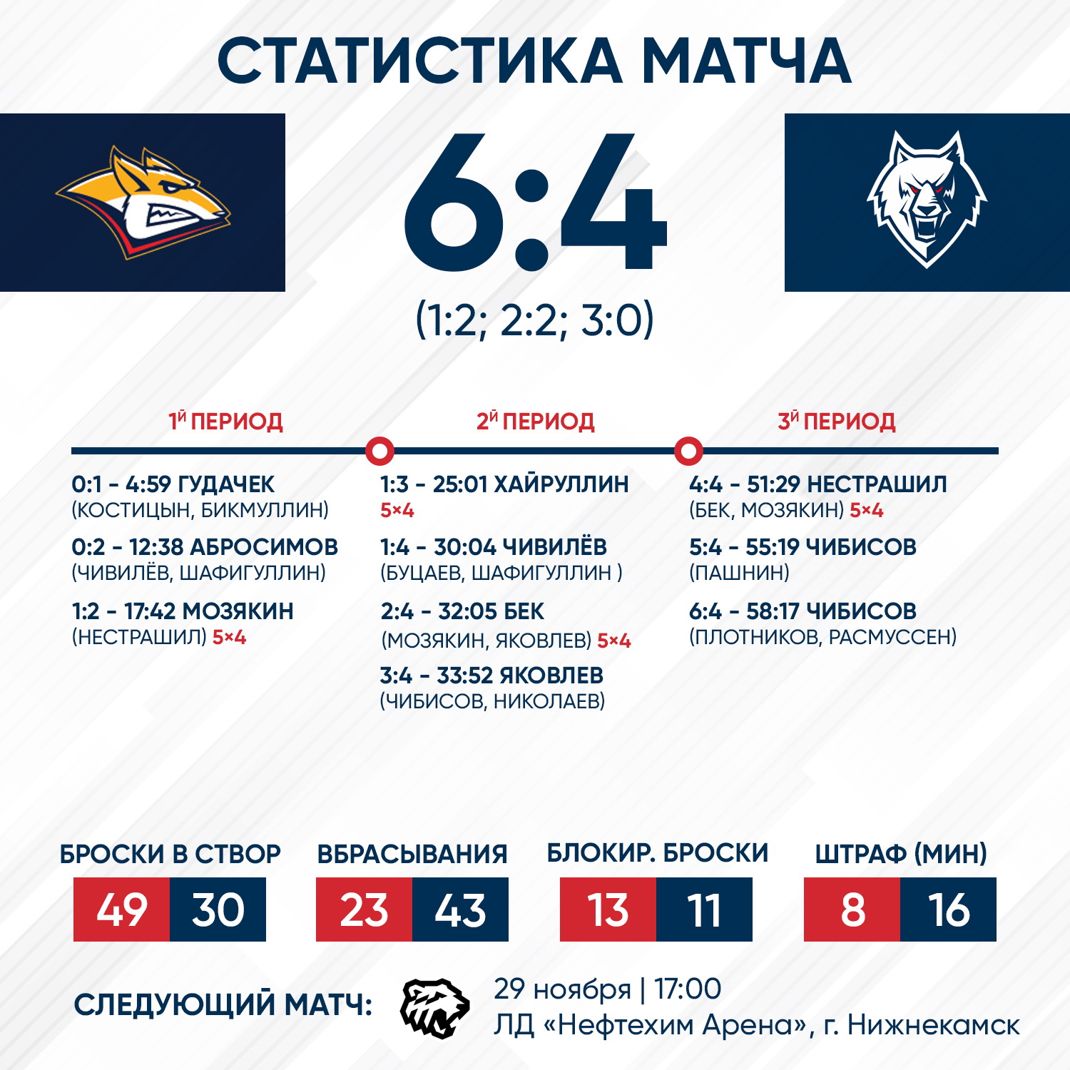 К 31-ой минуте поединка все для «волков» складывалось более чем позитивно. Благодаря шайбам Либора Гудачека, Романа Абросимова, Марата Хайруллина и Андрея Чивилёва «волки» вели 4:1. Однако голевой успех нашего молодого форварда остался последним в игре для «Нефтехимика». За оставшуюся часть поединка магнитогорцы забросили пять безответных шайб в ворота Константина Барулина. 4:6 - очень досадное поражение.Уже послезавтра, 29 ноября, «волки» начнут домашнюю серию. Первый соперник - челябинский «Трактор». Билеты можно приобрести в кассах или онлайн.
