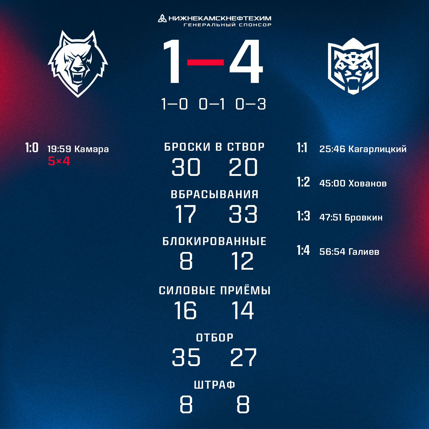 Для нижнекмцев первый период прошел удачно. Энтони Камара на последней секунде стартового отрезка реализовал большинство. Это первая шайба канадского форварда в свитере «Нефтехимика».Во втором периоде гости смогли сравнять счет. Исход этого контрольного матча решился в заключительные 20 минут, когда в ворота нашей команды зашло три безответные шайбы.