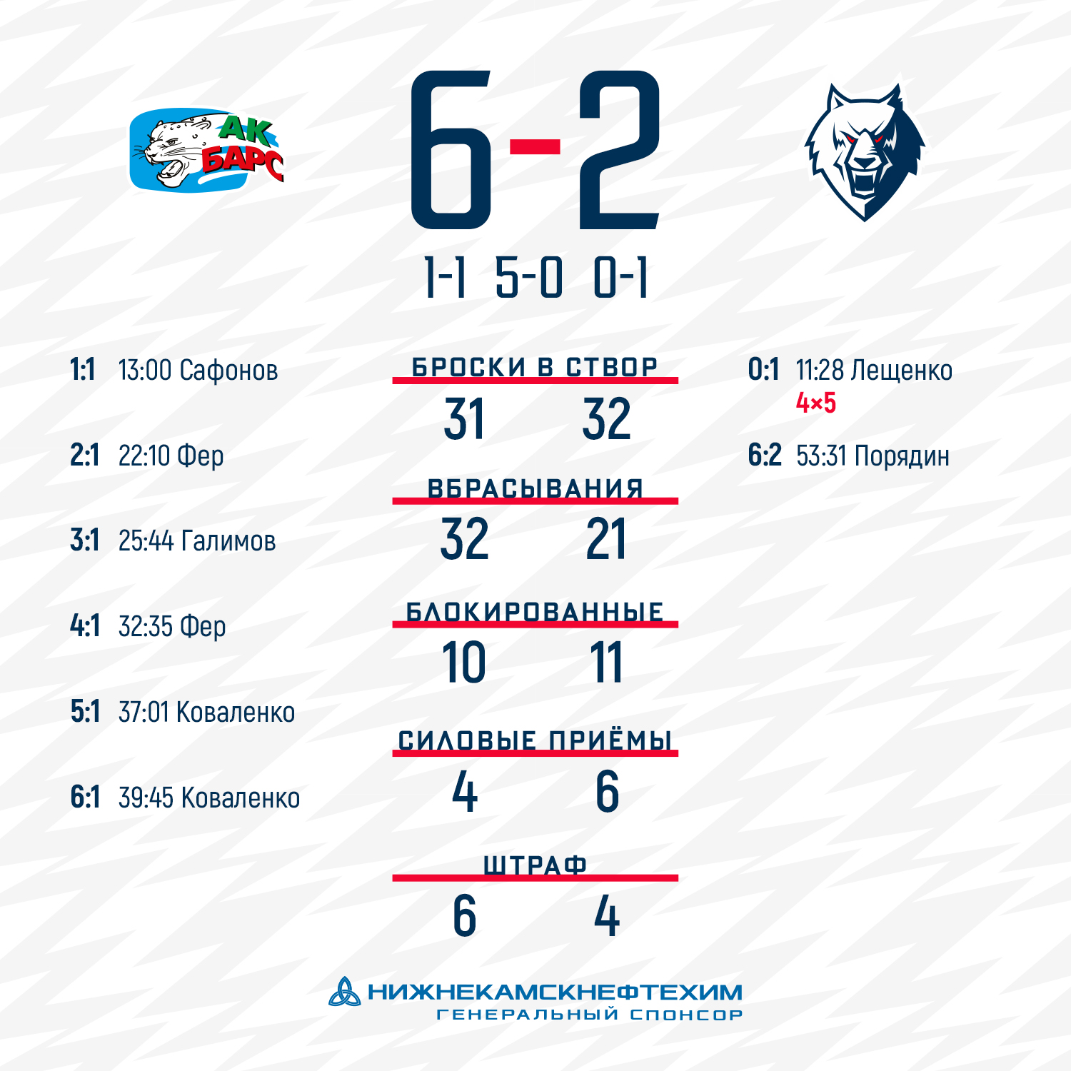 В середине первого периода наша команда открыла счет в меньшинстве после отличного броска Вячеслава Лещенко, но хозяева быстро счет сравняли.Исход очередного татарстанского дерби решился во втором периоде. Казанцы смогли забросить в ворота Александра Судницина пять безответных шайб. В заключительном отрезке матча Павел Порядин один гол отыграл, но большего сделать не получилось.