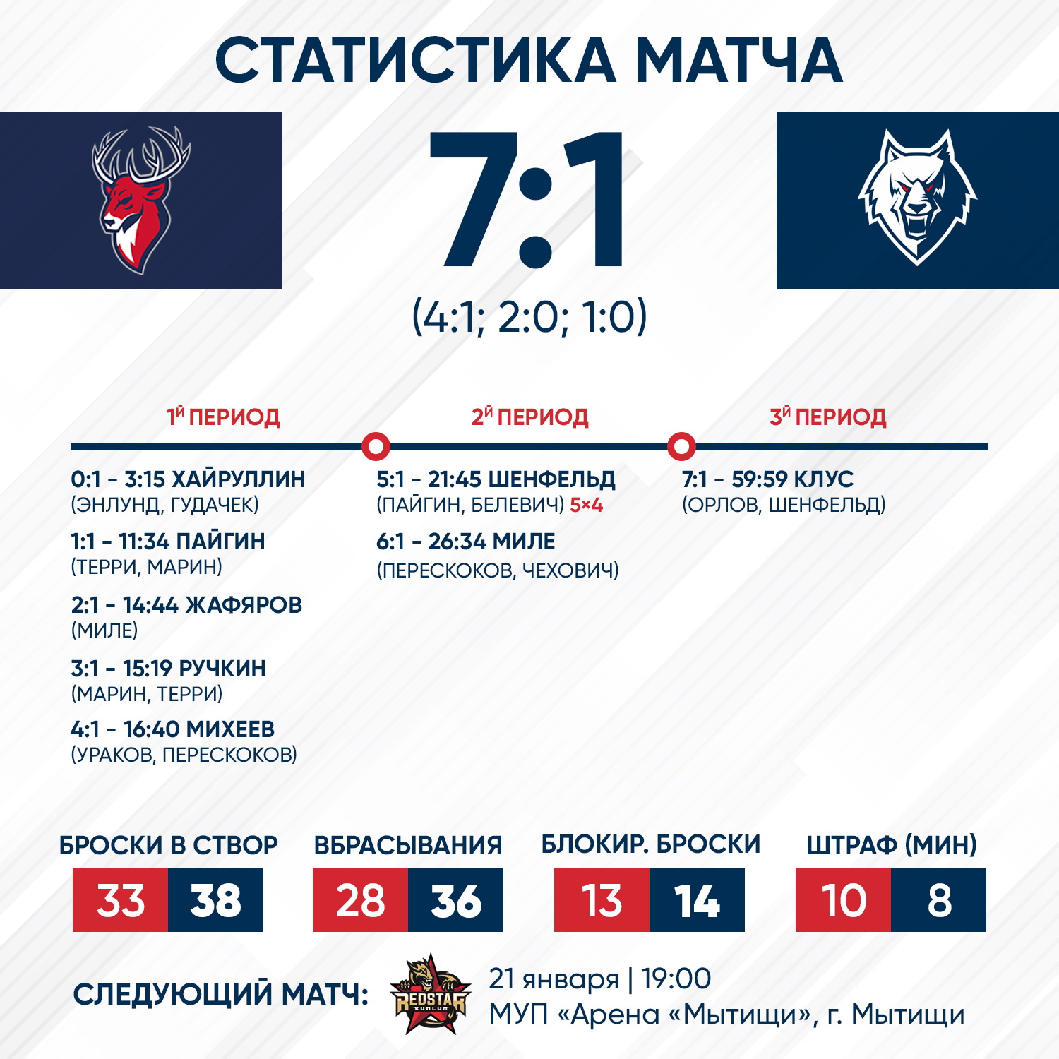 Начало игры выдалось для нас очень удачным. Уже на 4-ой минуте встречи Марат Хайруллин открыл счет. К сожалению, этот успех оказался единственным для нашей команды в этот вечер. Нижегородцы смогли реализовать свои моменты. Нижнекамцам же в завершающей стадии атак сегодня не хватило точности.Из Нижнего Новгорода «Нефтехимик» отправляется в Мытищи, где 21 января сыграет с «Куньлунь РС».