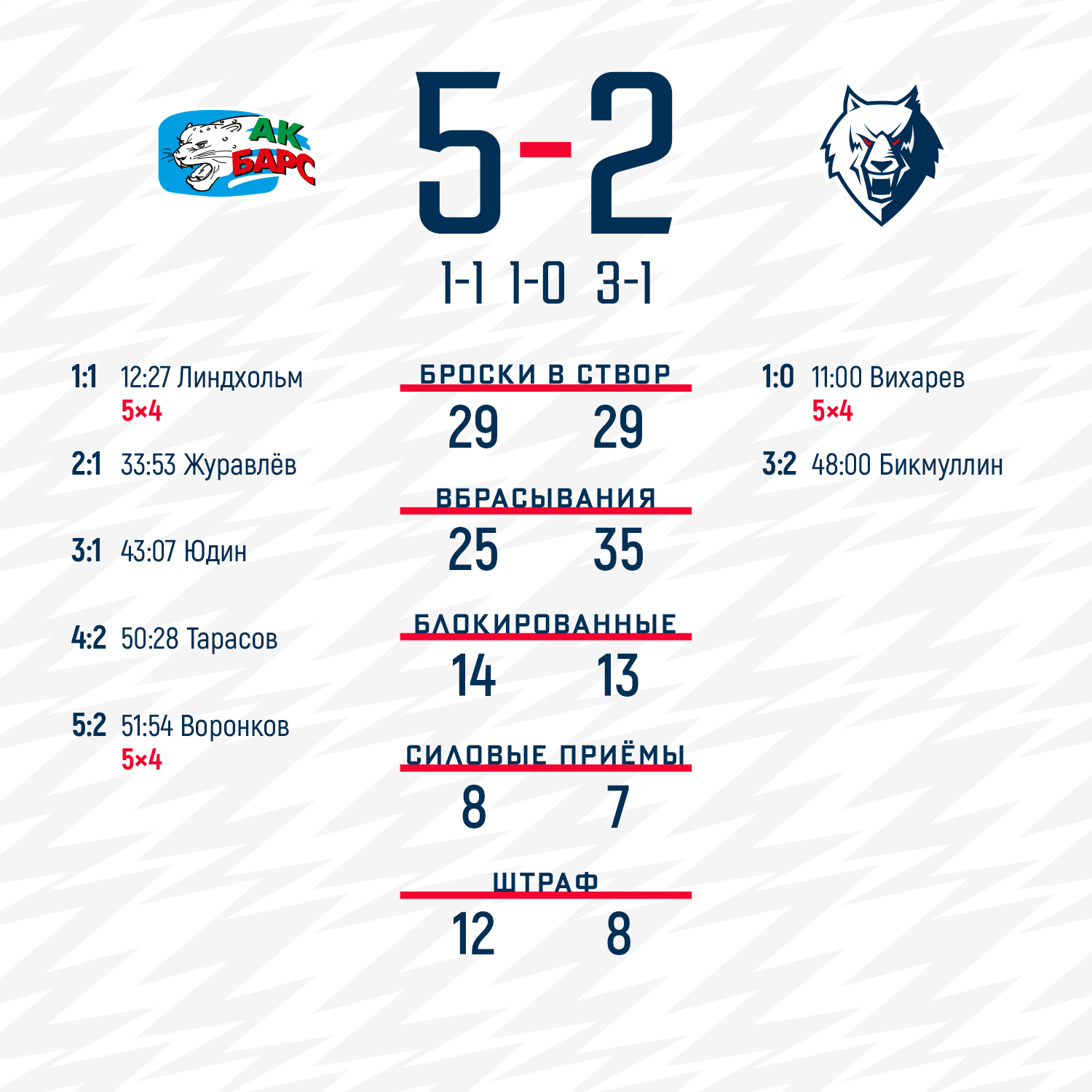 Начало игры получилось позитивным для нашей команды. Денис Вихарев реализовал большинство с передач Дэна Секстона и Рональда Кнота, но хозяева также в большинстве отыгрались, а во втором периоде и вовсе вышли вперед.Самым результативным получился третий отрезок игры. В его дебюте казанцы забросили третью шайбу, но Рафаэль Бикмуллин вернул нас в игру, отквитав один гол. Казалось появился шанс и сравнять счет, но хозяева буквально за три минуты еще дважды поразили ворота Александра Судницина, тем самым предопределил исход сегодняшнего поединка.