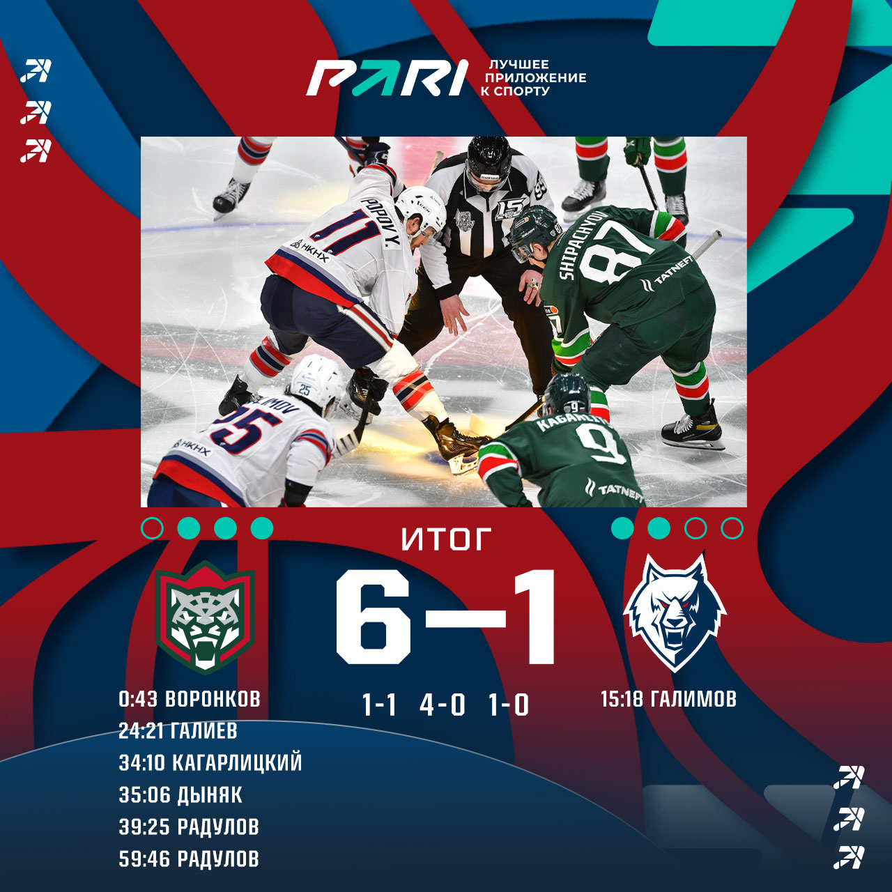 Первый период прошел в равной борьбе. На быстрый гол хозяев «волки» ответили шайбой Анселя Галимова с отличного паса Булата Шафигуллина. К сожалению, этот голевой успех у нас стал последним в этот вечер. Хозяева несколько раз реализовали большинство, что предрешило исход поединка. 1:6 в игре и теперь счет в противостоянии 2:3.Серия продолжится в Нижнекамске в субботу, 11 марта.