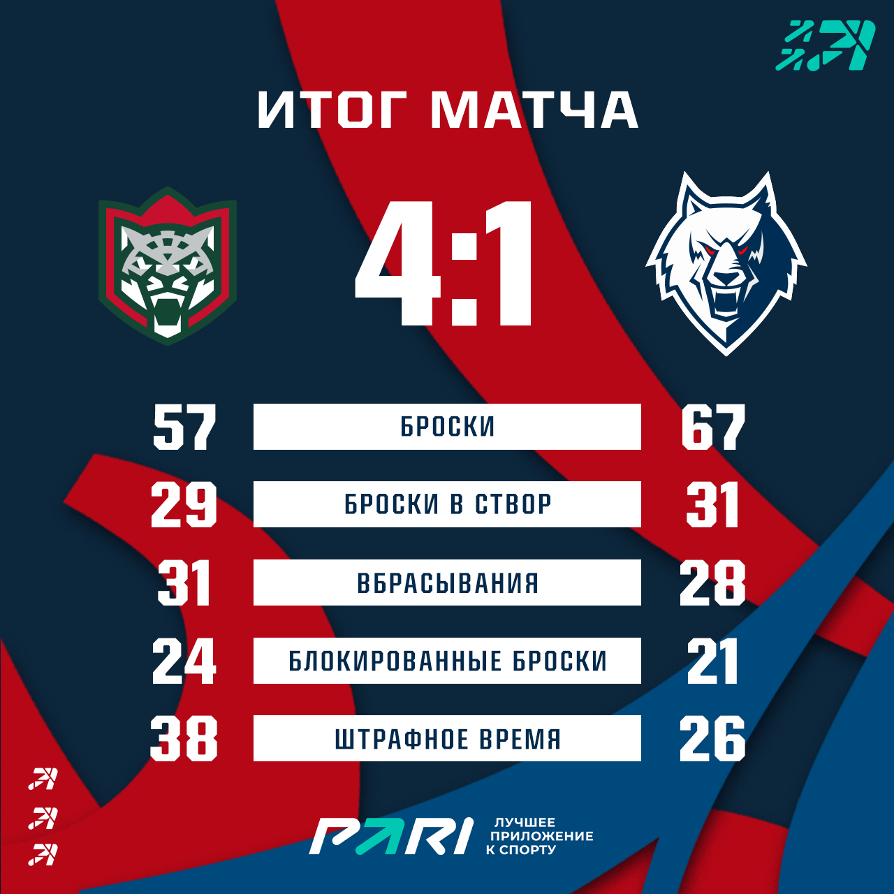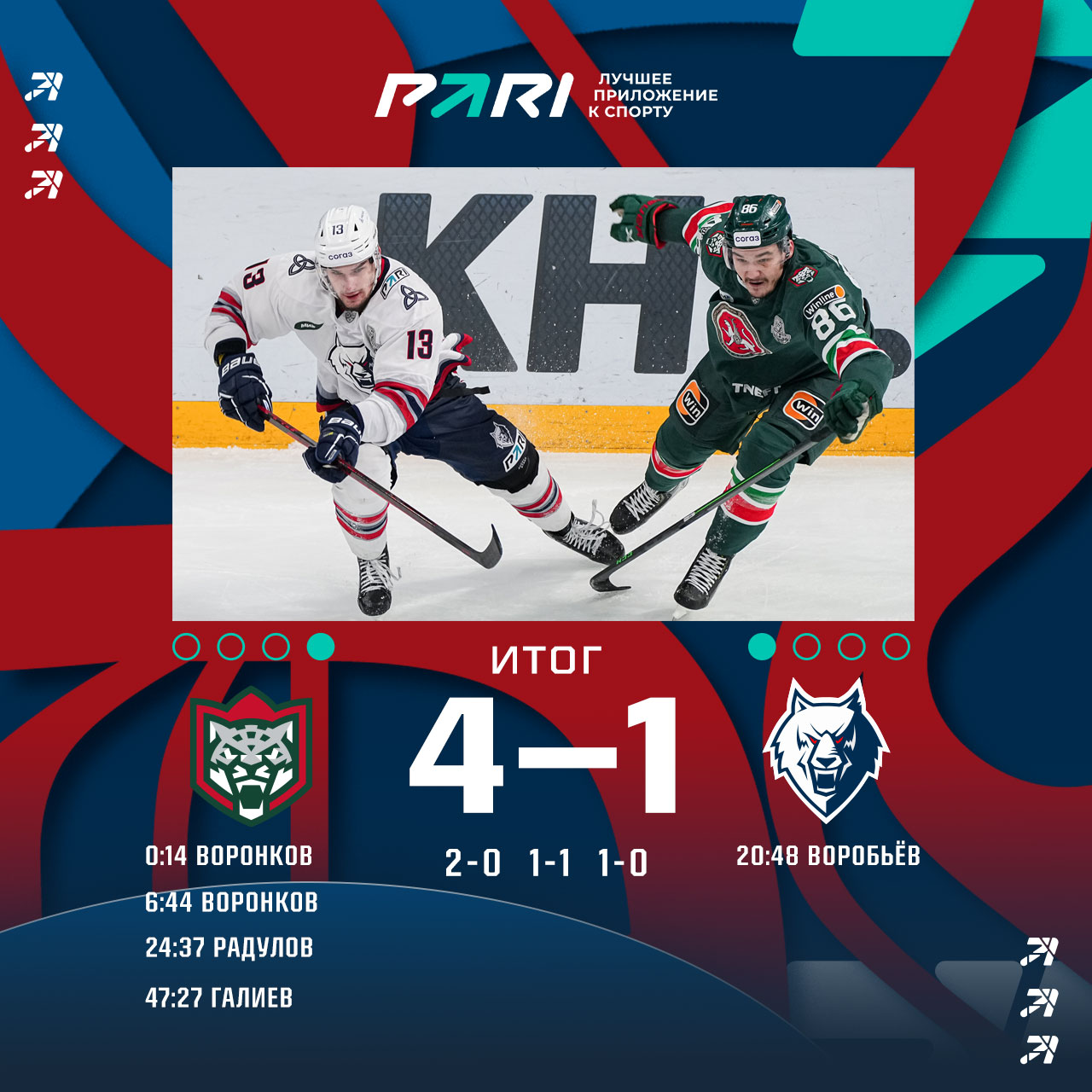 Хозяева очень мощно провели дебют игры и к 10-минуте уже вели 2:0. В самом начале второго периода Кирилл Воробьёв своей шайбой вернул нас в игру, но казанцы вскоре восстановили разрыв в счете.В третьем периоде у «волков» было много большинства, но реализовать его не получилось. Соперник же свой шанс использовал. Итог вечера - 1:4 в матче и 1:1 в серии