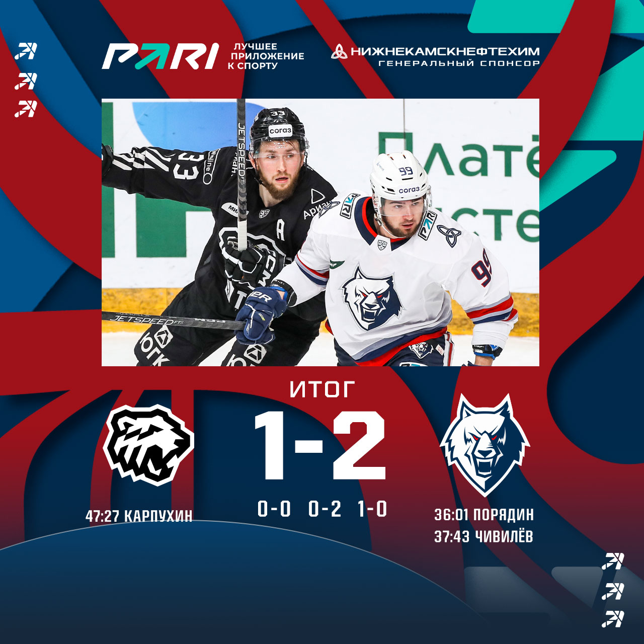 Игра получилась малорезультативной. Команды строго сыграли в обороне, а исход поединка решился в концовке второго периода, когда Павел Порядин и Андрей Чивилёв за минуту с небольшим дважды поразили ворота челябинцев.В третьем периоде черно-белые серьезно насели на ворота Эмиля Гарипова, но голкипер провел уверенный матч. «Трактор» один гол отыграл, но большего не добился. 2:1 - наша третья победа кряду.