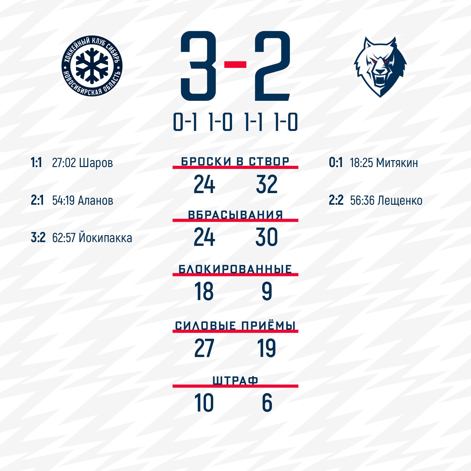 Счет мы смогли открыть в первом периоде. Шайбу забросил Евгений Митякин с паса Павла Порядина. Хозяева отыгрались во втором периоде.В заключительной трети снова шла равная борьба. Казалась любая шайба решит исход матча. «Сибиряки» вырвались вперед на 55-й минуте, но «волки» в очередной раз проявили характер и Вячеслав Лещенко смог сравнять цифры на табло в самой концовке игры. Поединок перешел в овертайм, где чуть удачливее были хозяева.