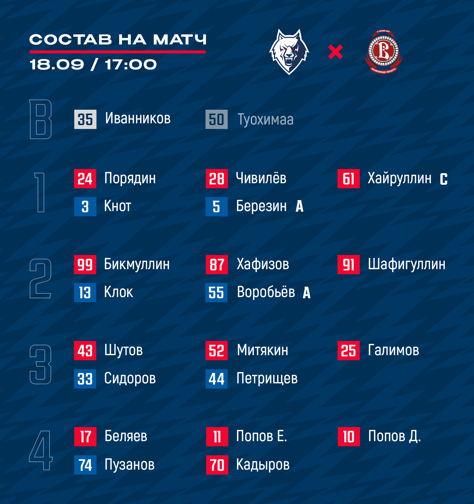 Стал известен состав нашей команды команды на матч регулярного чемпионата КХЛ с «Витязем».