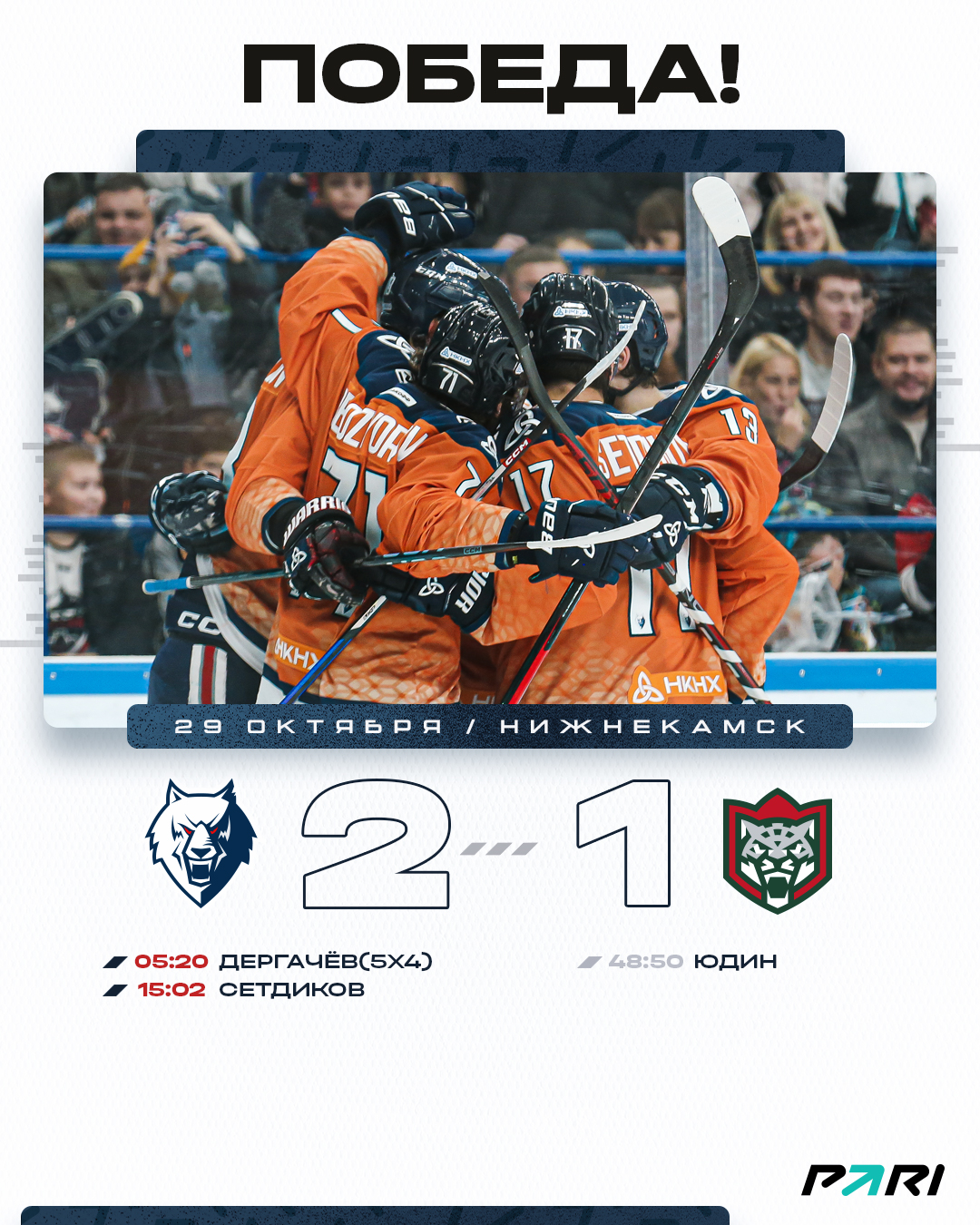 Во многом результат игры был предрешен в первом периоде, когда «волки» забросили две безответные шайбы. Отличились Александр Дергачёв и Никита Сетдиков.В дальнейшем ходе поединка «Нефтехимик» больше оборонялся. Снова надежную игру продемонстрировал вратарь Филипп Долганов. Сегодня в его активе 33 спасения. Гости смогли поразить его ворота лишь раз в середине третьего периода. 2:1 – первое дерби сезона забираем мы! Всего в домашней серии «волки» набрали 9 из 10 возможных очков.