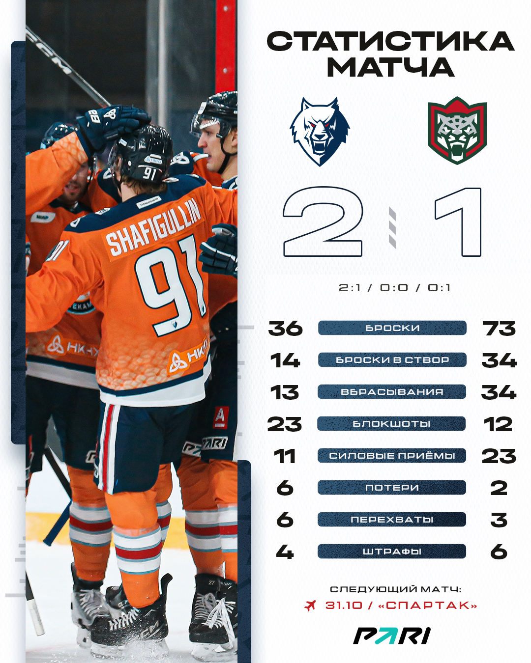 Наша команда завершила пятиматчевую домашнюю серию победой в татарстанском дерби над «Ак Барсом» со счетом 2:1.