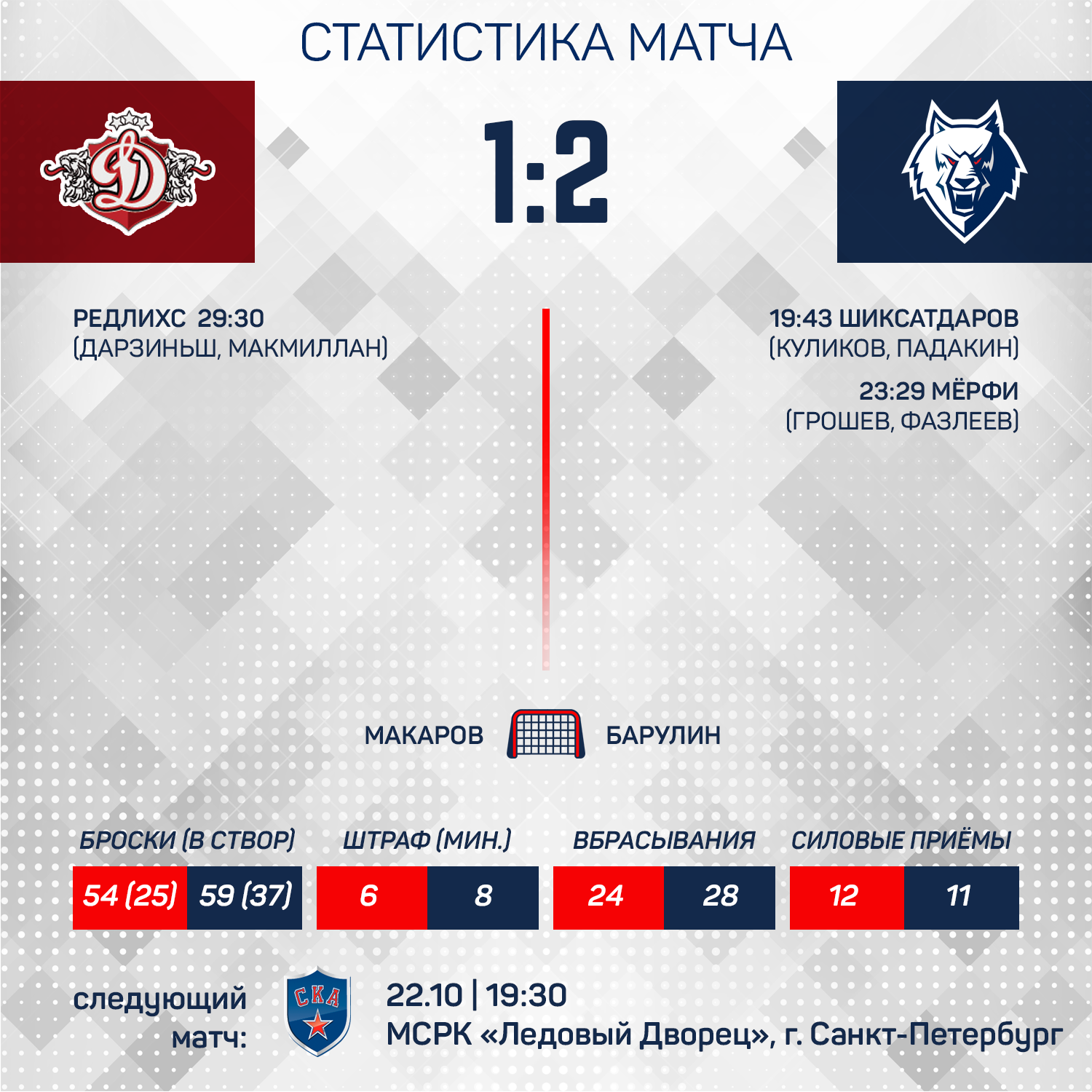 Счет открыл Ильдар Шиксатдаров за 17 секунд до конца первого периода, когда очень удачно сыграл на пятачке соперника.Вторые 20 минут начались для «волков» также крайне удачно. Райан Мерфи подкараулил отскок на вратаря рижан и забросил свою первую шайбу в КХЛ. Вскоре «Динамо» отыграли одну шайбу, но большего игроки «Нефтехимика» им сделать не позволили. 2:1 - третья подряд победа в чемпионате и первая в Риге с декабря 2011 года!
