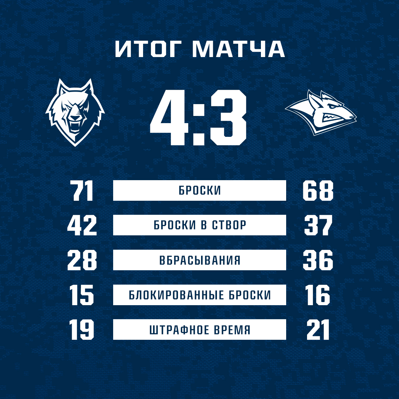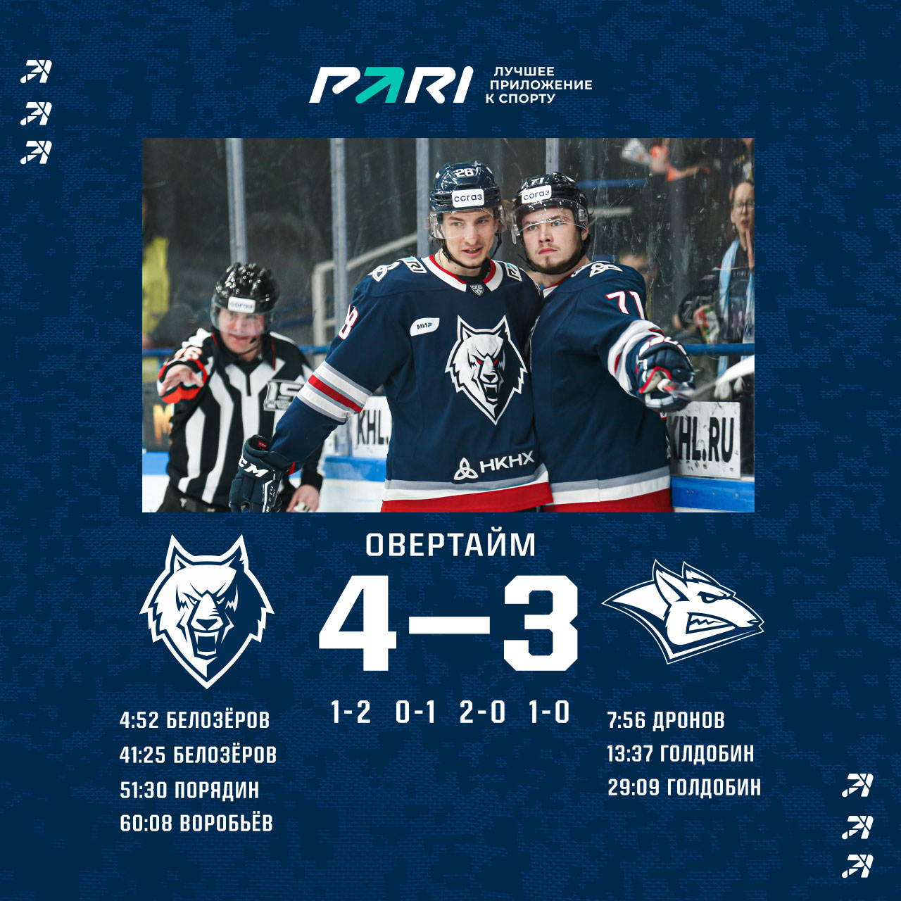 Сюжет этого поединка очень до определенного времени напоминал прошлую встречу с ХК «Сочи». Андрей Белозеров открыл счет, а гости ответили тремя шайбами подряд.На третий период «волки» выходили уступая 1:3, но проявили волю и при невероятное поддержке за 20 минут смогли сделать счет равным. Отличились Павел Порядин и снова Белозеров.