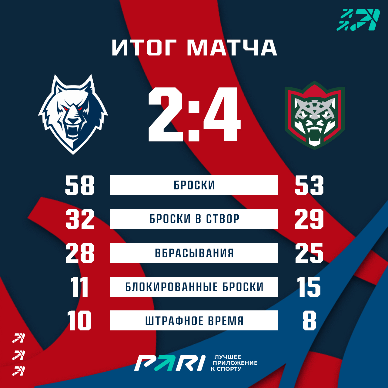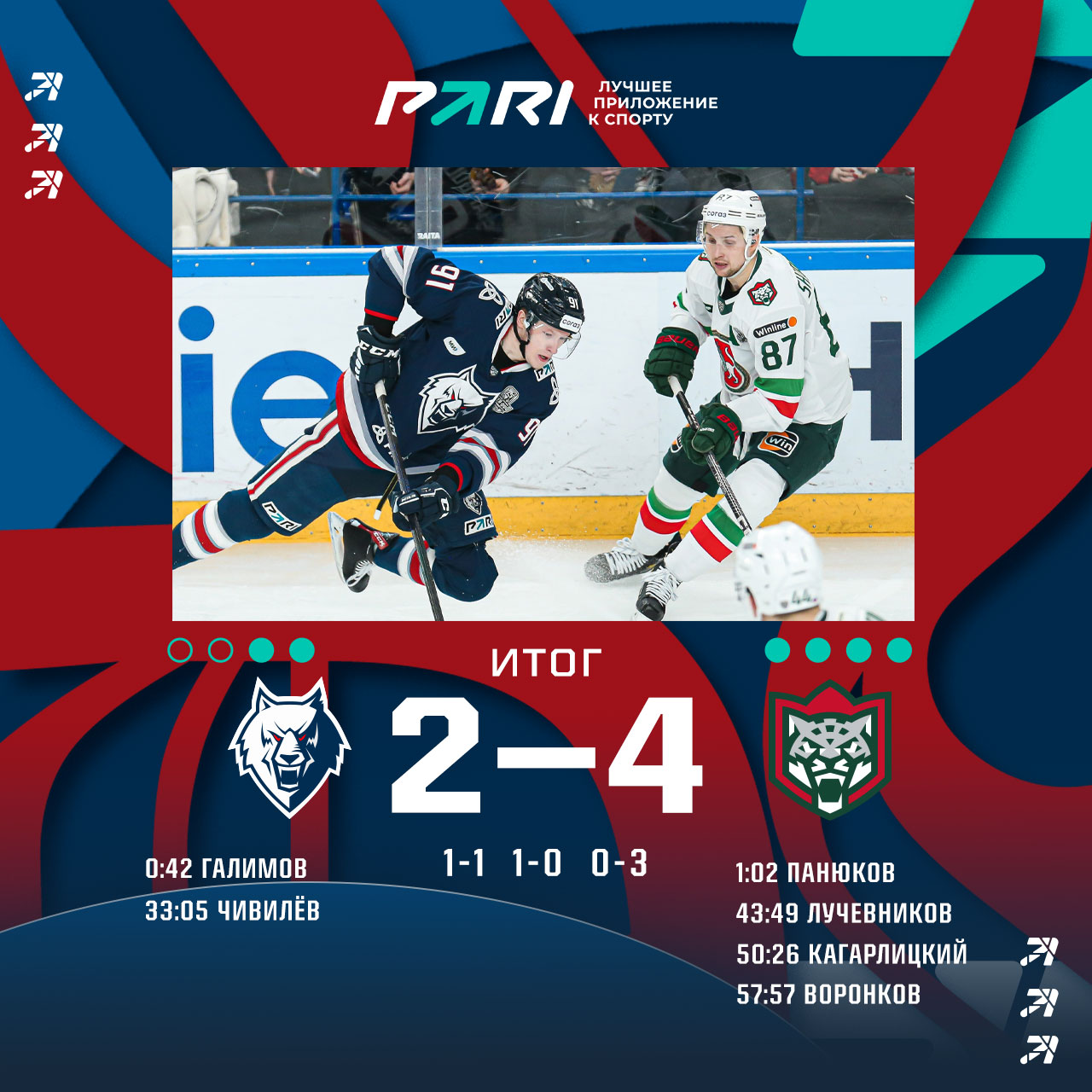 Игра для «волков» началась очень удачно. Ансель Галимов забил гол на первой минуте, но всего 20 секунд спустя гости счет сравняли.Во втором периоде Андрей Чивилёв реализовал большинство и снова вывел нас вперед. Однако третья двадцатиминутка у нижнекамцев не получилась. Гости забрали ее 3:0, а с ней матч 4:2. Серия также завершилась со счетом 4:2 в пользу казанцев.