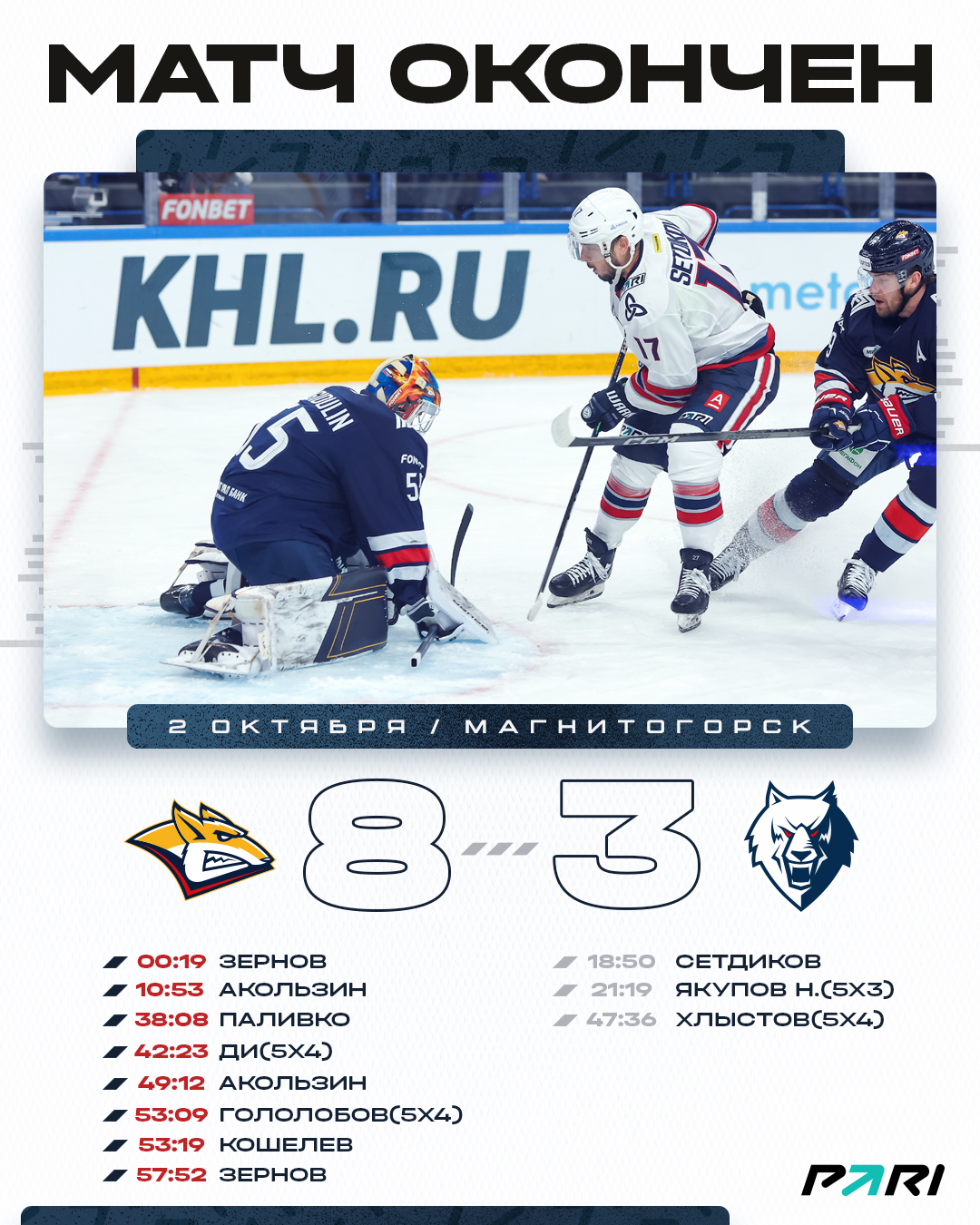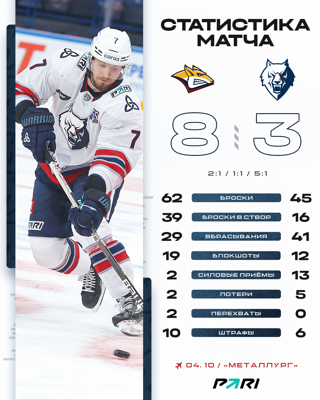 Хозяева быстро повели 2:0, но «волки» проявили волю и смогли отыграться. В первом периоде отличился Никита Сетдикова, а в дебюте второго - Наиль Якупов реализовал большинство.На второй перерыв команды при счете 3:2 в пользу хозяев. В начале заключительных 20 минут игры магниторгорцы снова сделали свое преимущество в два гола, но точный бросок Никиты Хлыстова в большинстве оставил нам шансы на спасение.