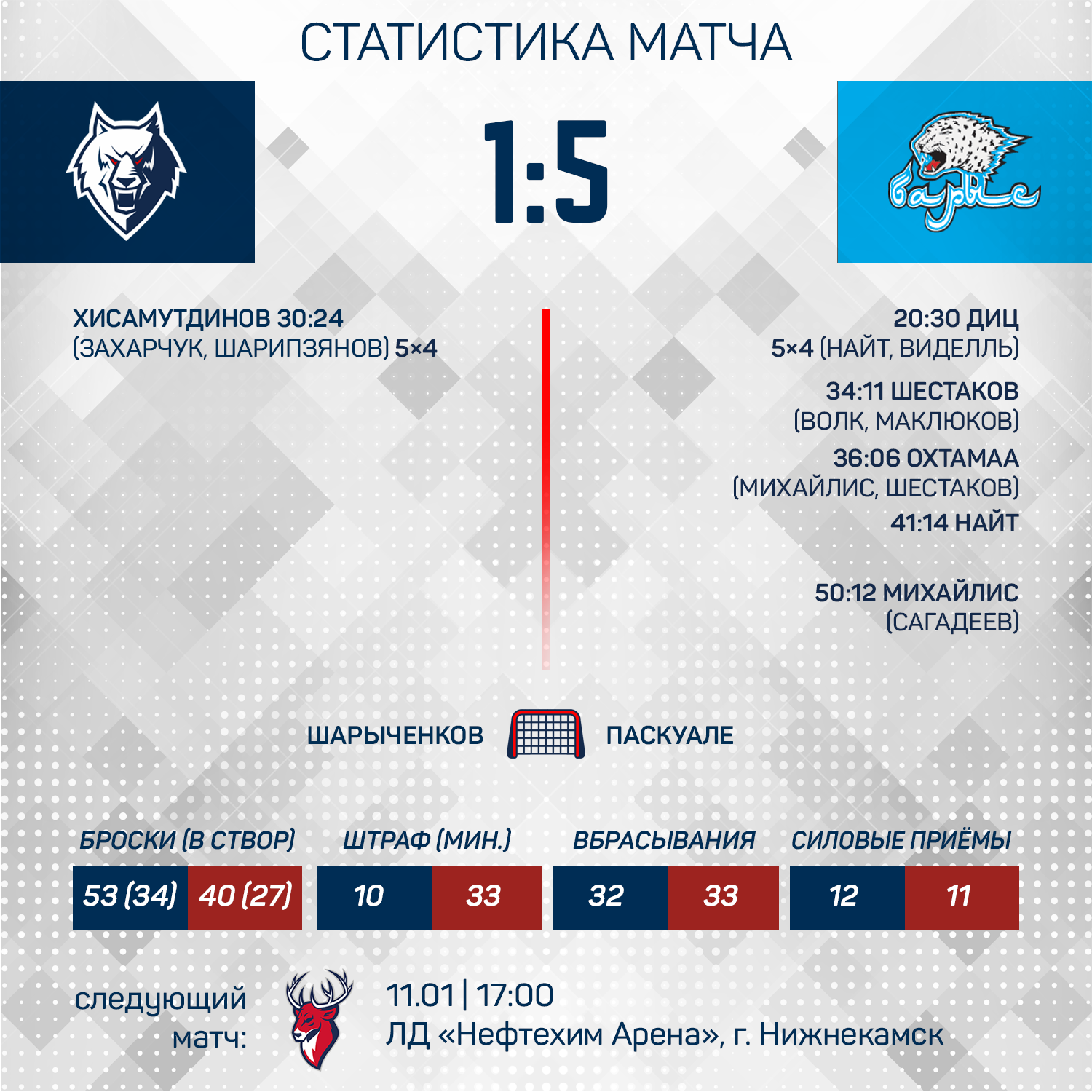 В первом периоде счет не был открыл и завершился со счетом 0:0. В середине второй двадцатиминутки команды обменялись шайбами в большинстве. В составе «волков» первую шайбу в сезоне забросил Арсен Хисамутдинов. Однако в дальнейшем ходе игры голевой успех сопутствовал только гостям. 1:5 - неутешительный для нас итог сегодняшнего поединка.Следующий матч на «Нефтехим Арене» состоится в субботу, 11 января, когда в гости к нашей команде приедет «Торпедо». Билеты можно приобрести в кассах или на нашем сайте.