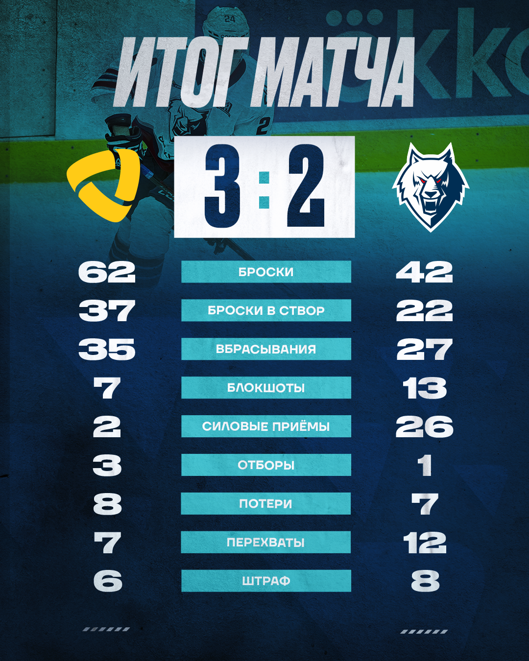 В начале третьего периода наша команда вновь пропустила. На отбитую Озолиным шайбу откликнулся Чебыкин. «Волки» довольно скоро сравняли счет, причем, играя в меньшинстве. После ювелирного по точности передачи Шафигуллина дальний угол ворот поразил Сериков. Тут же наша команда могла забросить и третью шайбу. Вновь голевой момент создал Булат. Однако выручил свою команду Скотников.
