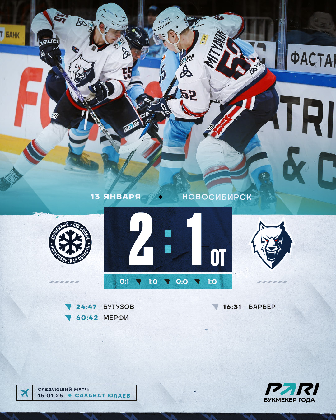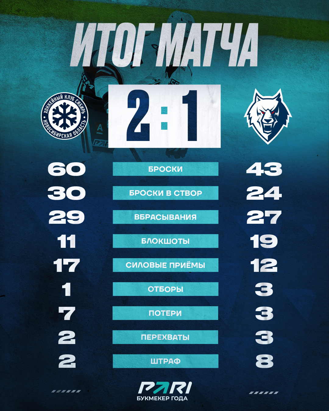 Хозяева же постепенно выровняли игру. На помощь своей команде также активно подключилась десятитысячная арена - шестой полевой игрок «Сибири». Давление на ворота Долганова нарастало и нашим парням пришлось две минуты играть в меньшинстве. Грамотно построив игру вчетвером, «волки» не дали шансов сопернику воспользоваться большинством.