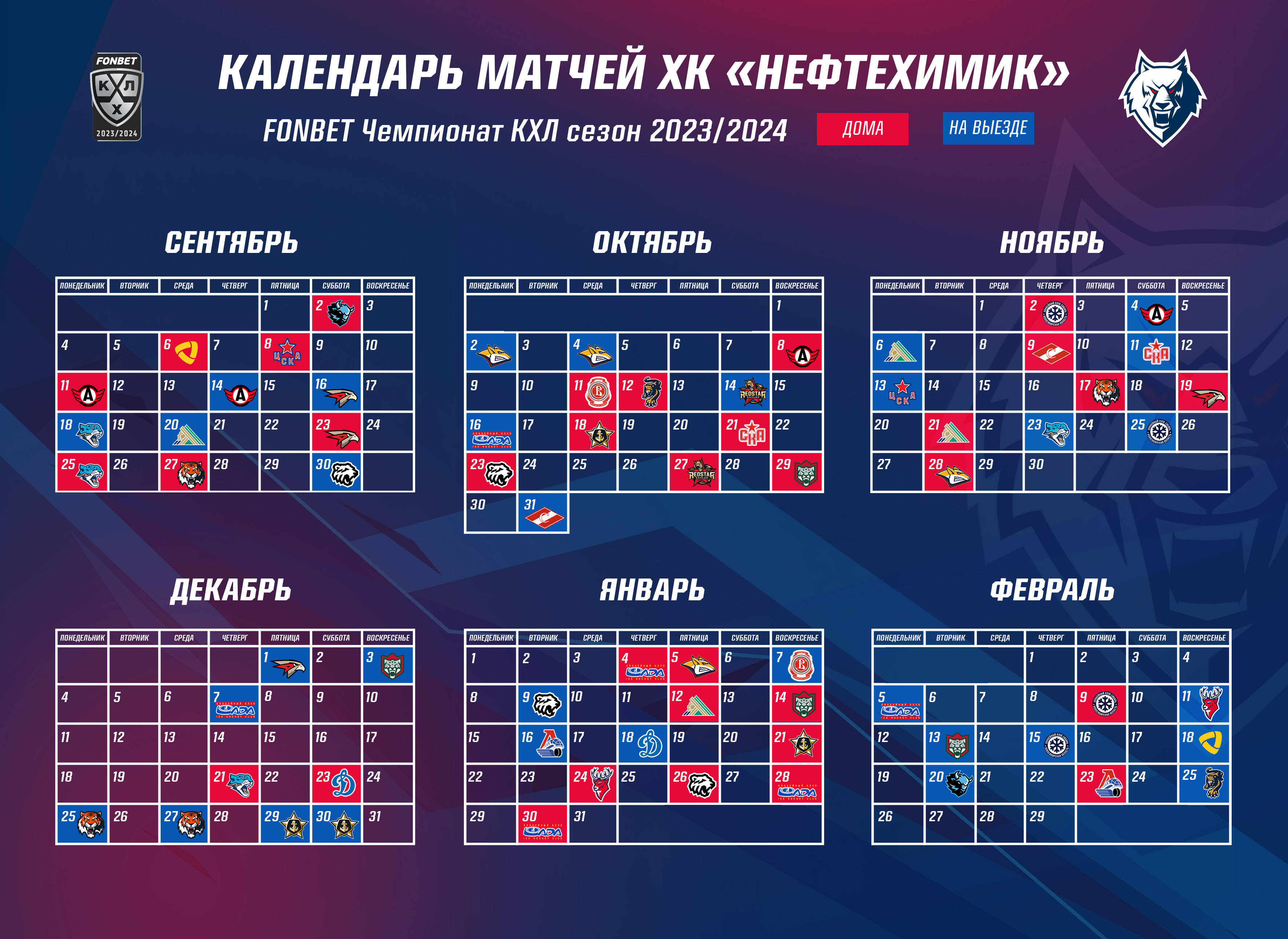 Каждая команда в предстоящем сезоне проведет по 68 матчей. Игры стартуют 1 сентября 2023 года и завершаться 26 февраля 2024 года.Представляем вашему вниманию расписание поединков «Нефтехимика».