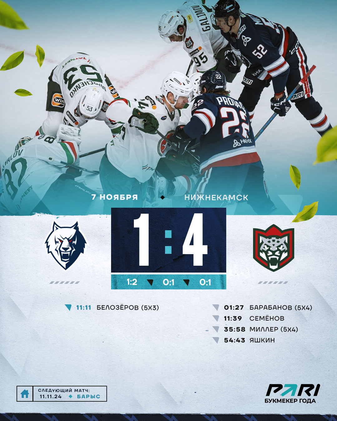 Заключительном периоде «барсы» забросили четвертую шайбу и обеспечили себе победу в первом татарстанском дерби этого сезона.