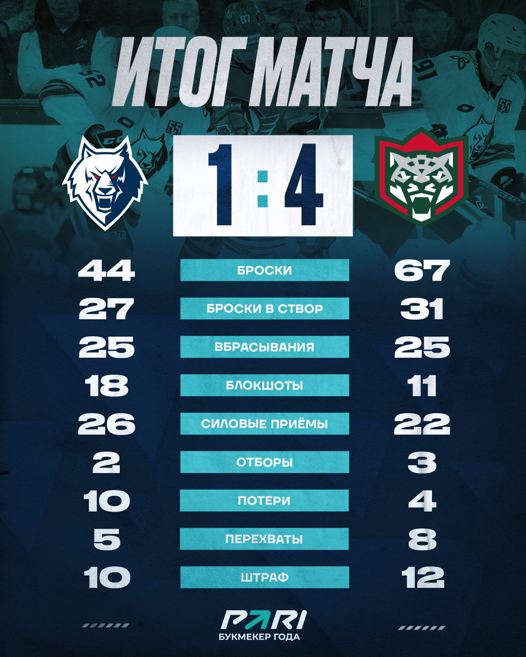 Гости на первых же минутах матча реализовали большинство. Барабанов удачно подставил клюшку, изменив траекторию полета броска.Пропущенный гол только разозлил хозяев площадки. Они раз за разом стали создавать опасные моменты у ворот Билялова. Сначала Сериков бросил из убойной позиции, но Тимур справился с этой угрозой. Позднее, уже в большинстве, «волки», пытались добить шайбу, но безуспешно. Зато болельщики увидели небольшую потасовку между Профакой и Сафоновым, в результате чего оба были отправлены в штрафной бокс. Нашим удалось реализовать большинство! Арена стала свидетелем гола-фантома от Белозёрова. Однако после гола игра продолжилась, судьи посчитали, что шайба не пересекла линию ворот. Но время всё расставило на свои места, в конечном итоге шайба была засчитана. Уйти на перерыв при ничейном счете наши ребята не смогли. «Ак Барс» быстро забил вторую шайбу.