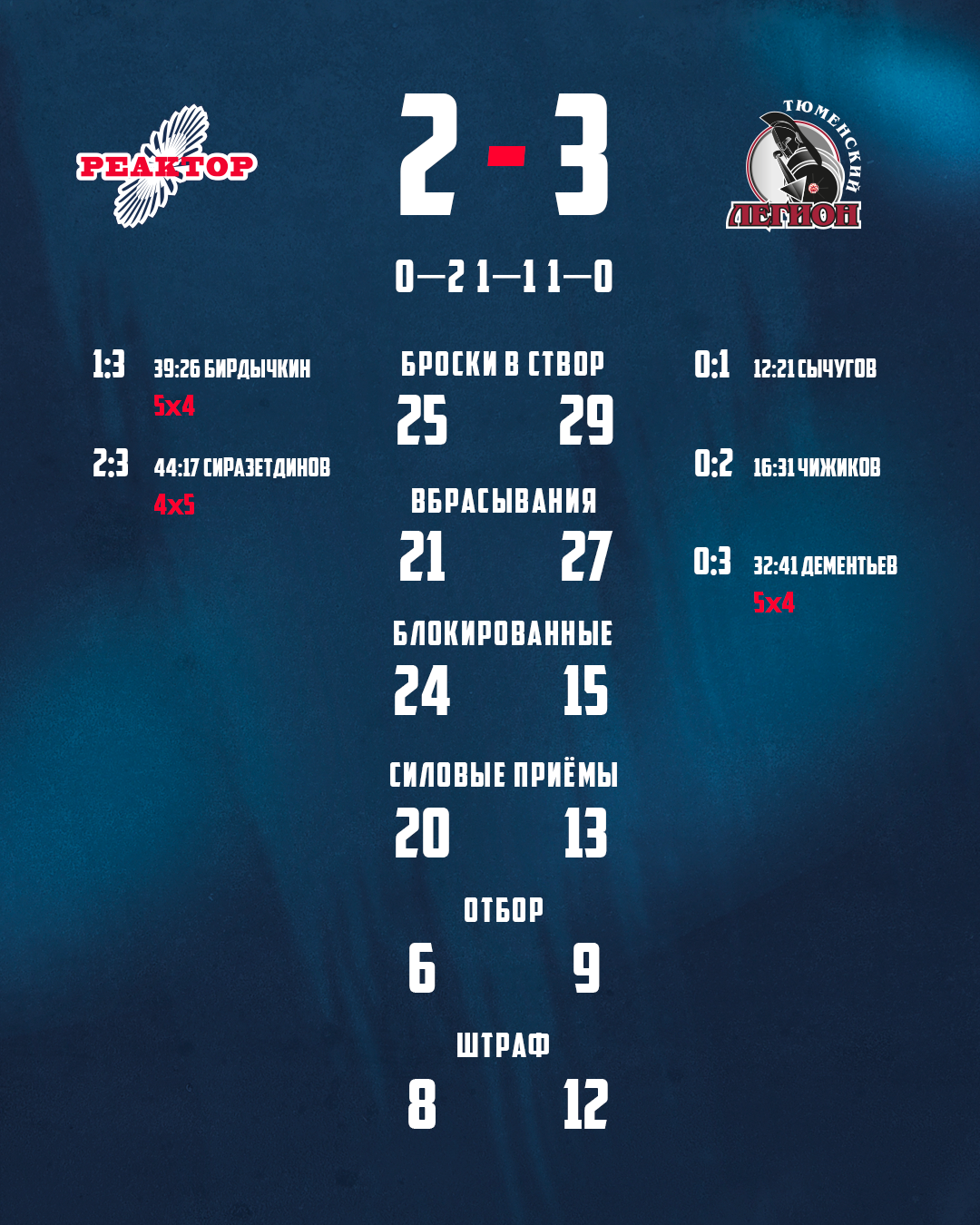 В предыдущих двух играх турнира нижнекамцам удавалось отыгрывать одну и две шайбы, а затем побеждать. Сегодня к середине поединка «реакторщики» уступали в три гола. Вот такое отставание отквитать уже не получилось. Тем не менее удалось проявить волю и характер, отыграв две шайбы и имея массу шансов сравнять счет.