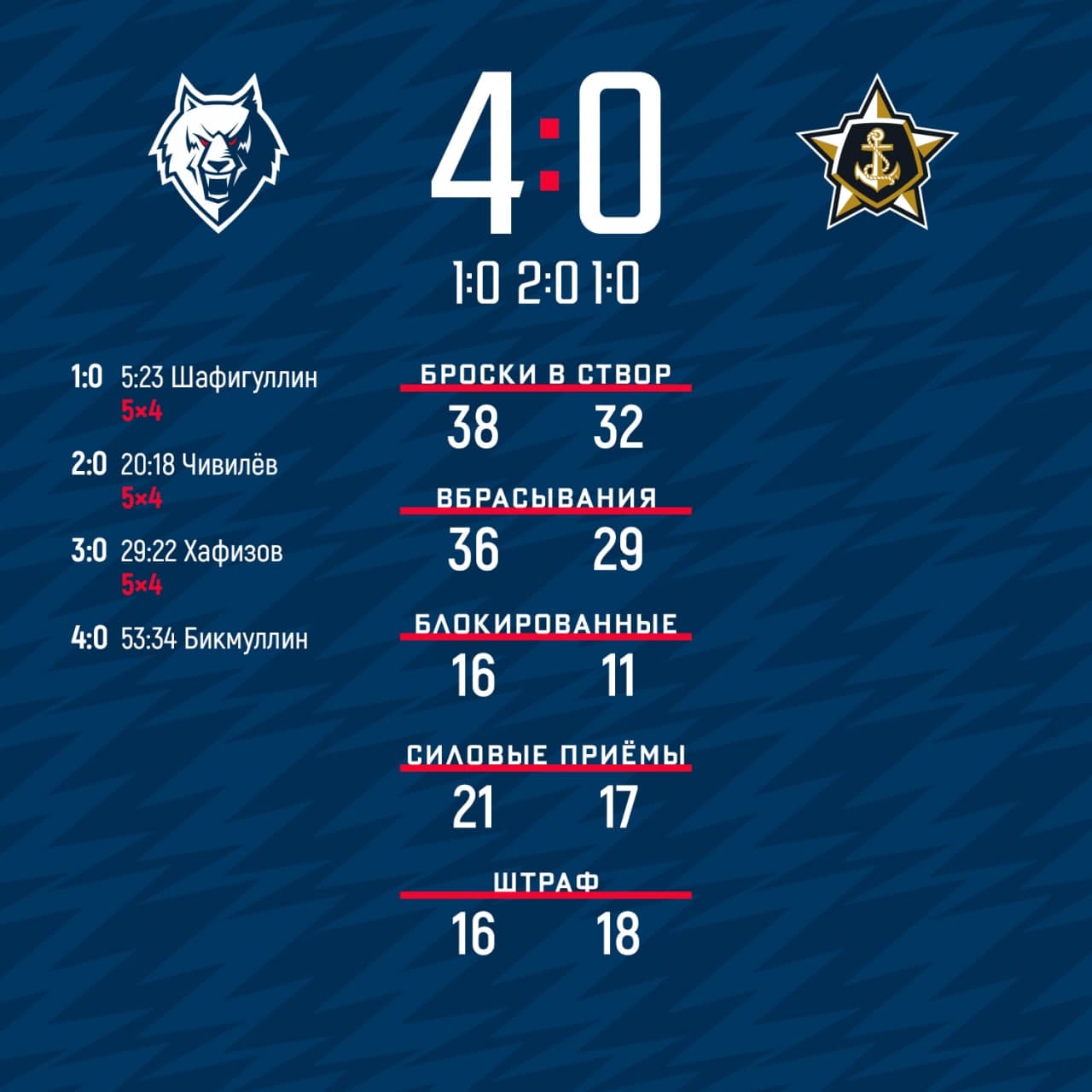 Впервые за несколько матчей «волки» первыми забросили. Сделал это Булат Шафигуллин на шестой минуте игры. Так, ведя в счете 1:0, «Нефтехимик» ушел на первый перерыв.Уже на 18 секунде второго периода Андрей Чивилёв отличился, а спустя девять минут Тимур Хафизов довел счет до 3:0. Причем все три шайбы наши игроки забросили в большинстве.