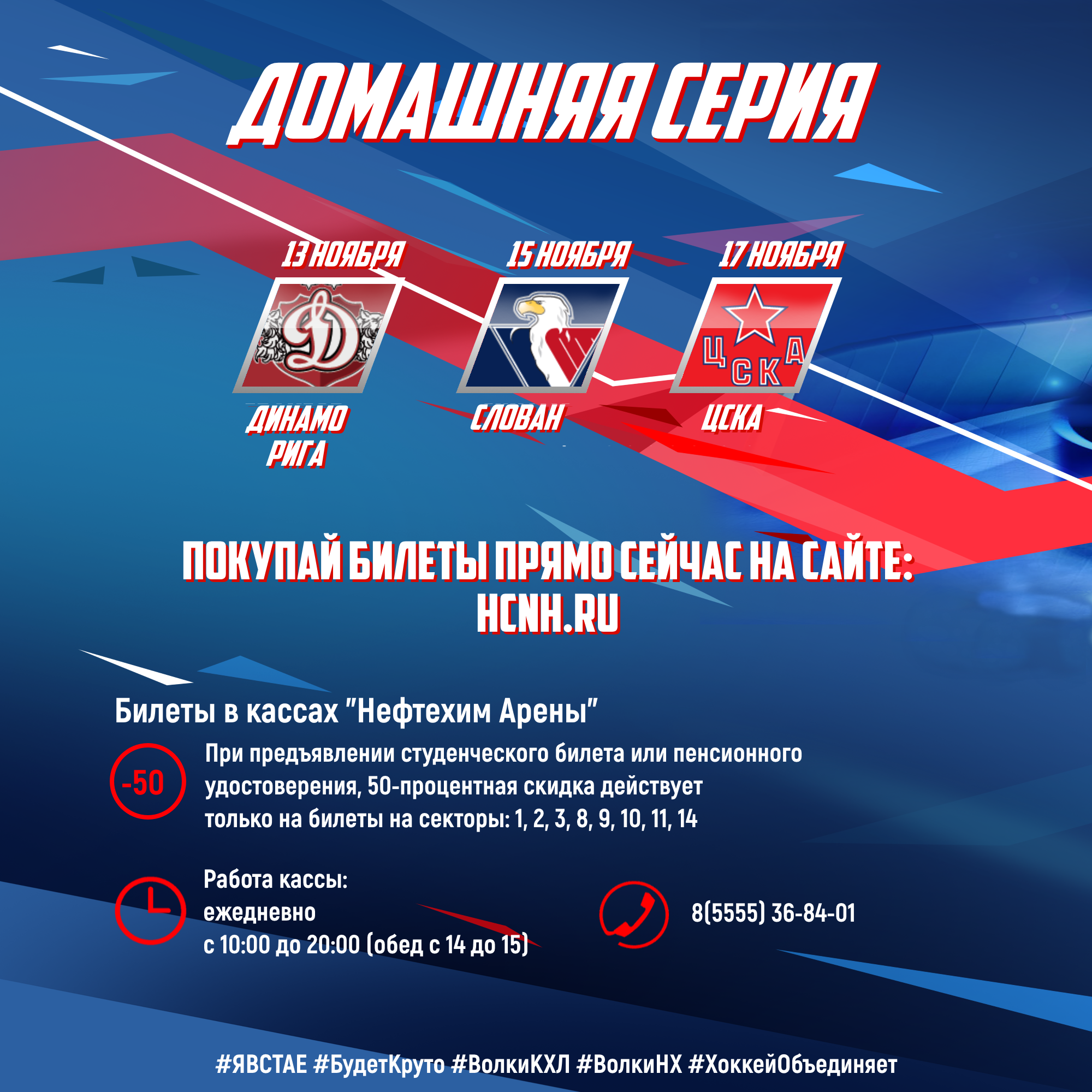 ВНИМАНИЕ АКЦИЯ!!!При приобретении билета на хоккейный матч "Нефтехимик" - "Динамо Рига" (13.11.2018) предоставляется право выкупа билета по 100 рублей на матч "Нефтехимик" - "Слован" (15.11.2018).