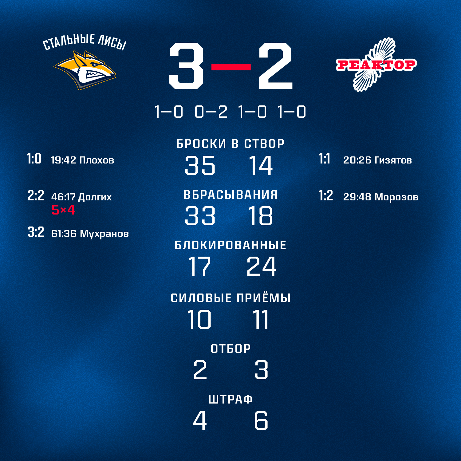 В первом периоде нижнекамцы пропустили гол на последних секундах. Сразу перерыва Амир Гизятов забил ответный гол, а несколько минут спустя Григорий Морозов реализовал большинство и вывел «Реактор» вперед.В начале третьего периода «Лисы» в свою очередь реализовали большинство и сделали счет равным. Он и продержался до конца основного времени. В овертайме хозяева после долгой атаки вырвали победу в этом поединке.