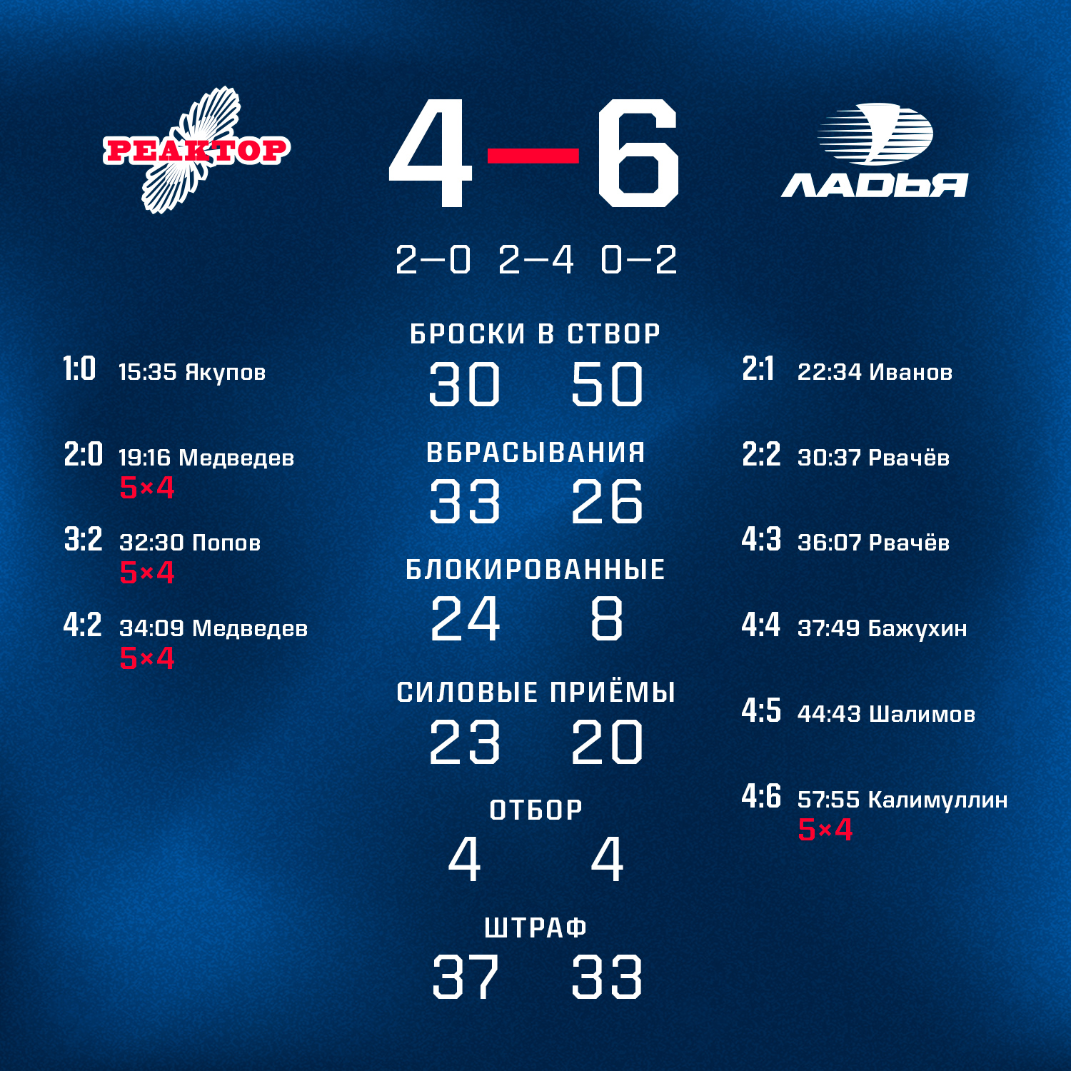 Первый период удался «Реактору». Благодаря шайбам Рауля Якупова и Данилы Медведева к первому перерыву счет был 2:0.После 15-минутного отдыха «Ладья» быстро цифры на табло сравняла, но нижнекамцы снова создали задел в два гола после шайб Ильи Попова и Медведева, у которого сегодня дубль. Однако и этот гандикап тольяттинцы быстро ликвидировали. 4:4 перед заключительным периодом.