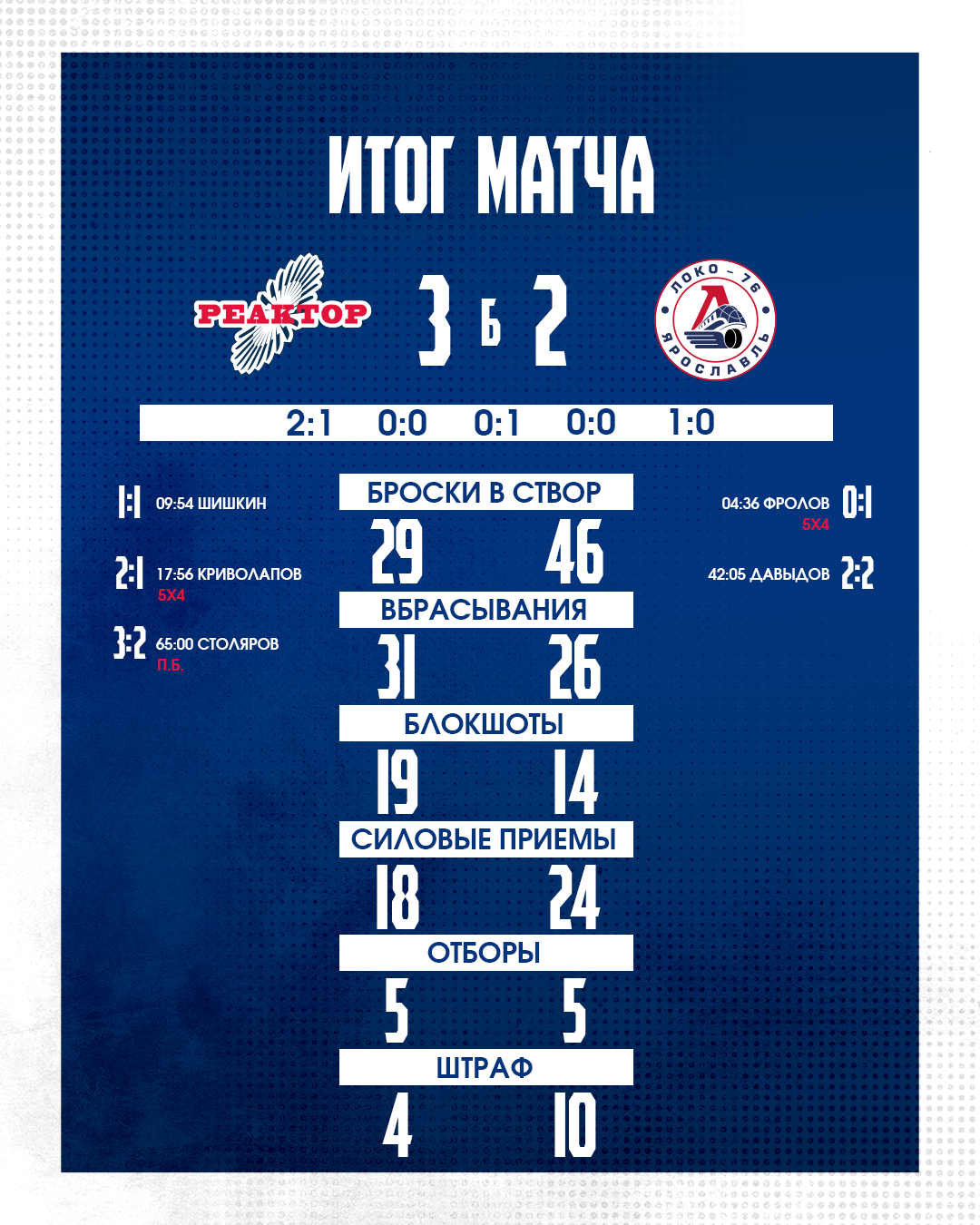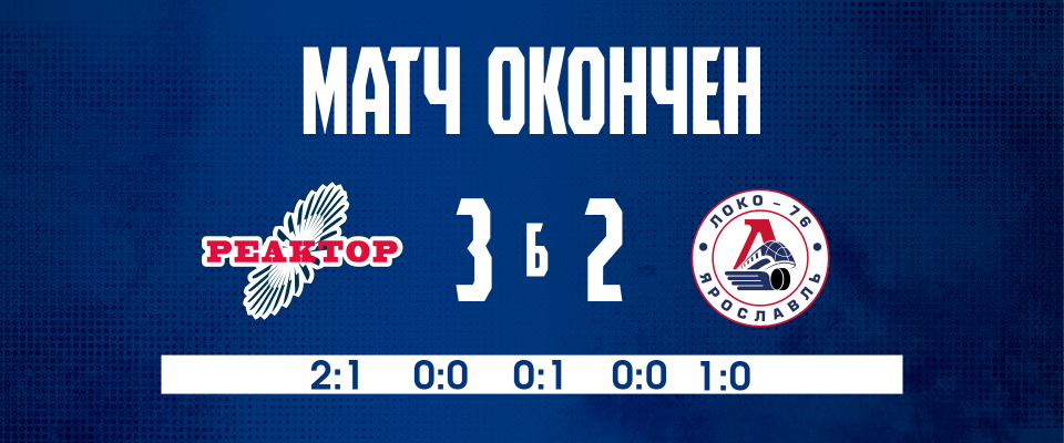 В самом начале заключительного периода гости смогли сравнять счет. Вообще эти 20 минут можно назвать бенефисом вратаря нижнекамцев Семёна Любалина, который держал команду в игре и вытаскивал самые сложные броски. Основное время завершилось вничью 2:2. В овертайме гости снова были ближе к победе, но Любалин и тут не подвел. Матч перешел в серию буллитов, где победу хозяевам принес точный бросок Кирилла Столярова. «Реактор» забирает две важнейшие победы у ярославской команды и приближается к первому месту «серебряного» дивизиона Востока МХЛ.